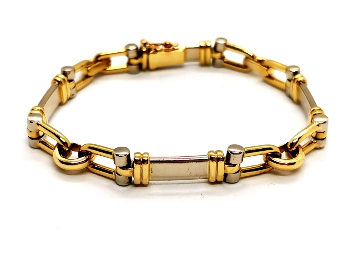 Bracelet gourmette étrier. en or jaune et or blanc 750 millièmes (18 carats). longueur: 19cm. largeur: 0.79 cm. épaisseur: 0.60 cm. fermoir avec huit de sécurité. poids total: 25.64 g. poinçonné Hibou. excellent état.