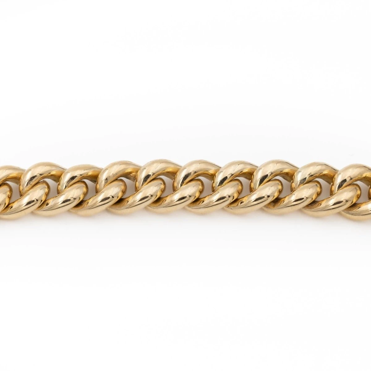 Barcelet en or jaune 750 millièmes (18 carats). maille gourmette massive. longueur du bracelet : 19.50 cm. largueur : 1.22 cm. fermoir avec double huit de sécurité. poids total : 67.63 g. poinçon hibou. excellent état