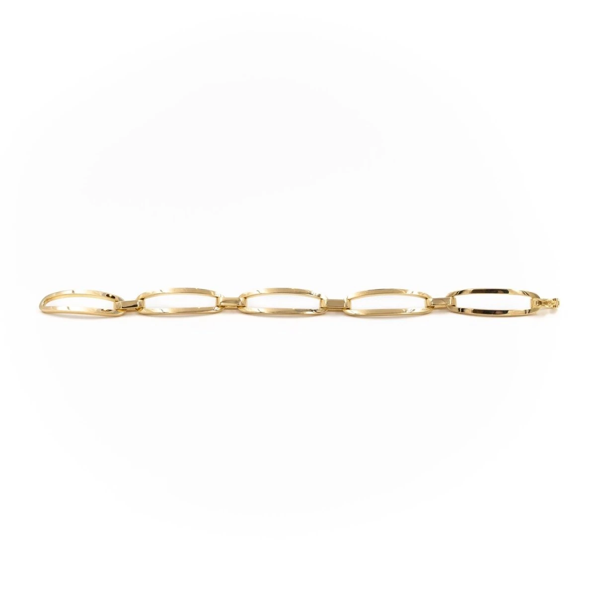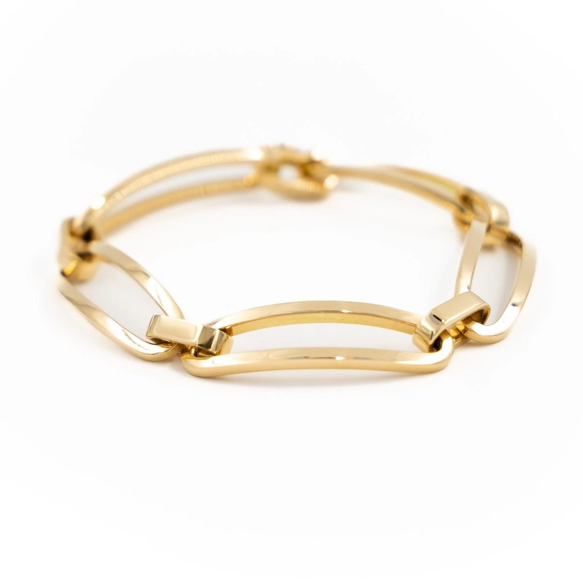 Bracelet gourmette en or jaune 750 millièmes (18 carats). Longueur: 19 cm. Largeur: 1 cm. fermoir avec huit de sécurité. poids total: 30.70 g. Poinçon tête d’aigle. excellent état