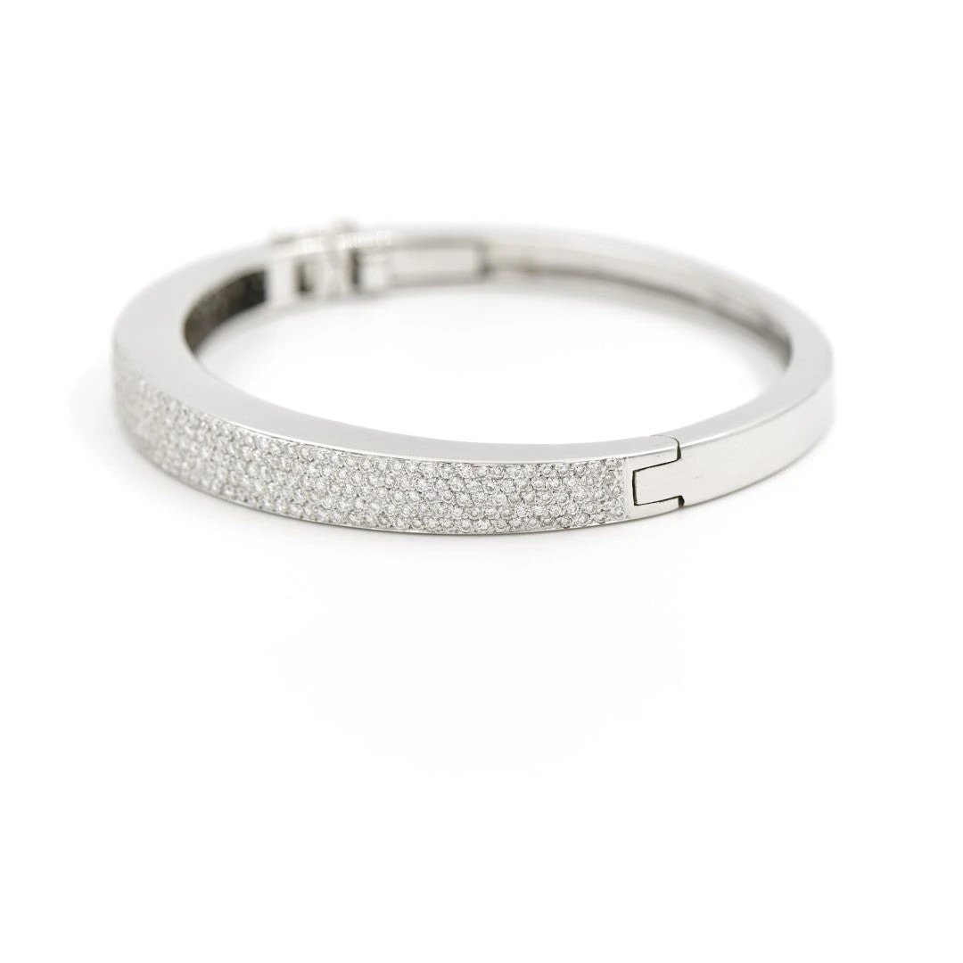 Bracelet jonc ouvrant. en or blanc 750 millièmes (18 carats). 400 diamants taille brillant d’environ 0.008 ct chacun. poids total diamants : 3.20 cts. tour de poignet : 16 cm. largeur sur le dessus : 0.70 cm. poids total : 34.07 g. poinçon tête d’aigle. excellent état