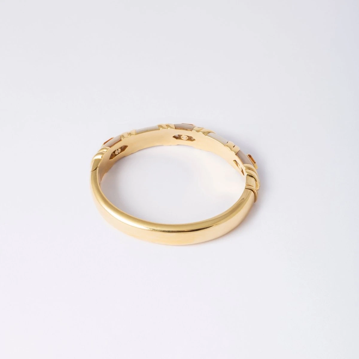 Bracelet Jonc en en or jaune 18 carats et or blanc 18 carats, plaqué de nacre et orné de trois citrines, deux lignes de diamants encadrant la pierre centrale. Circa 1980.