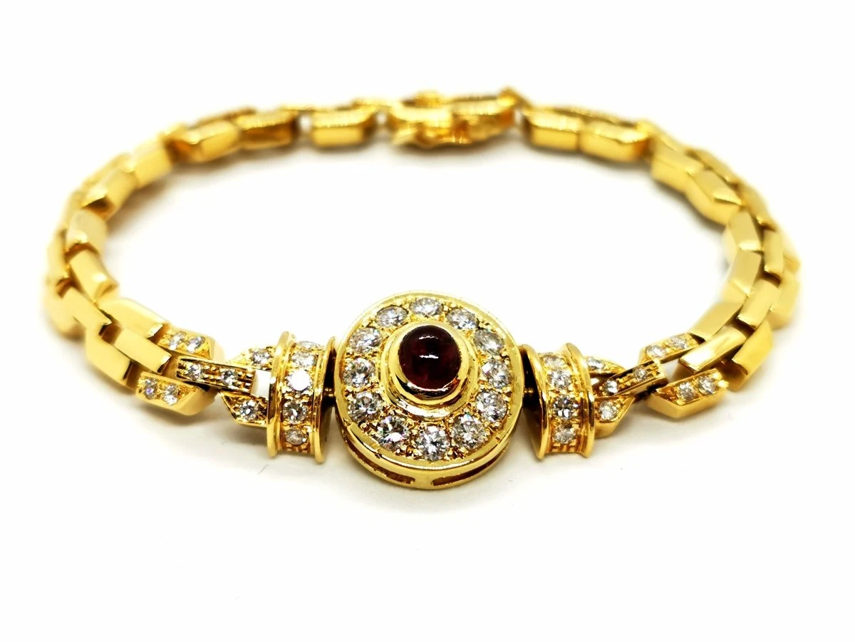 Bracelet serti d’un rubis et de diamants. en or jaune 750 millièmes (18 carats). mailles souples et brillantes. celles épaulant le motif central pavées de diamants. un cabochon de rubis d’environ 0.67 ct. entouré de 38 diamants environ d’un poids total d’environ 1.17 ct. fermoir avec double huit de sécurité. longueur: 17 cm. largeur maille: 0.59 cm. épaisseur maille: 0.26 cm. dimensions motif pavé de diamant (dont mailles sertie): 4.30 cm x 1.50 cm. poids total: 21.41 g. poinçon hibou. excellent état