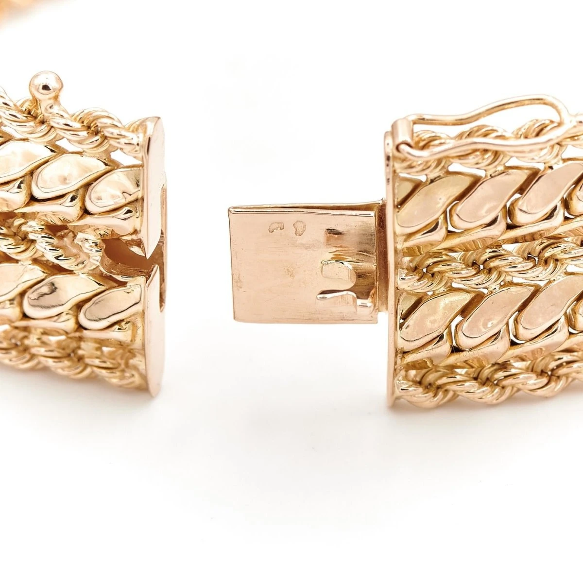 Bracelet en or jaune 750 millièmes (18 carats). maille gourmette et torsadée. fermoir en huit de sécurité. longueur : 20.5cm. largeur : 2.3cm. poids : 53.11g. poinçon tête d’aigle. excellent état.