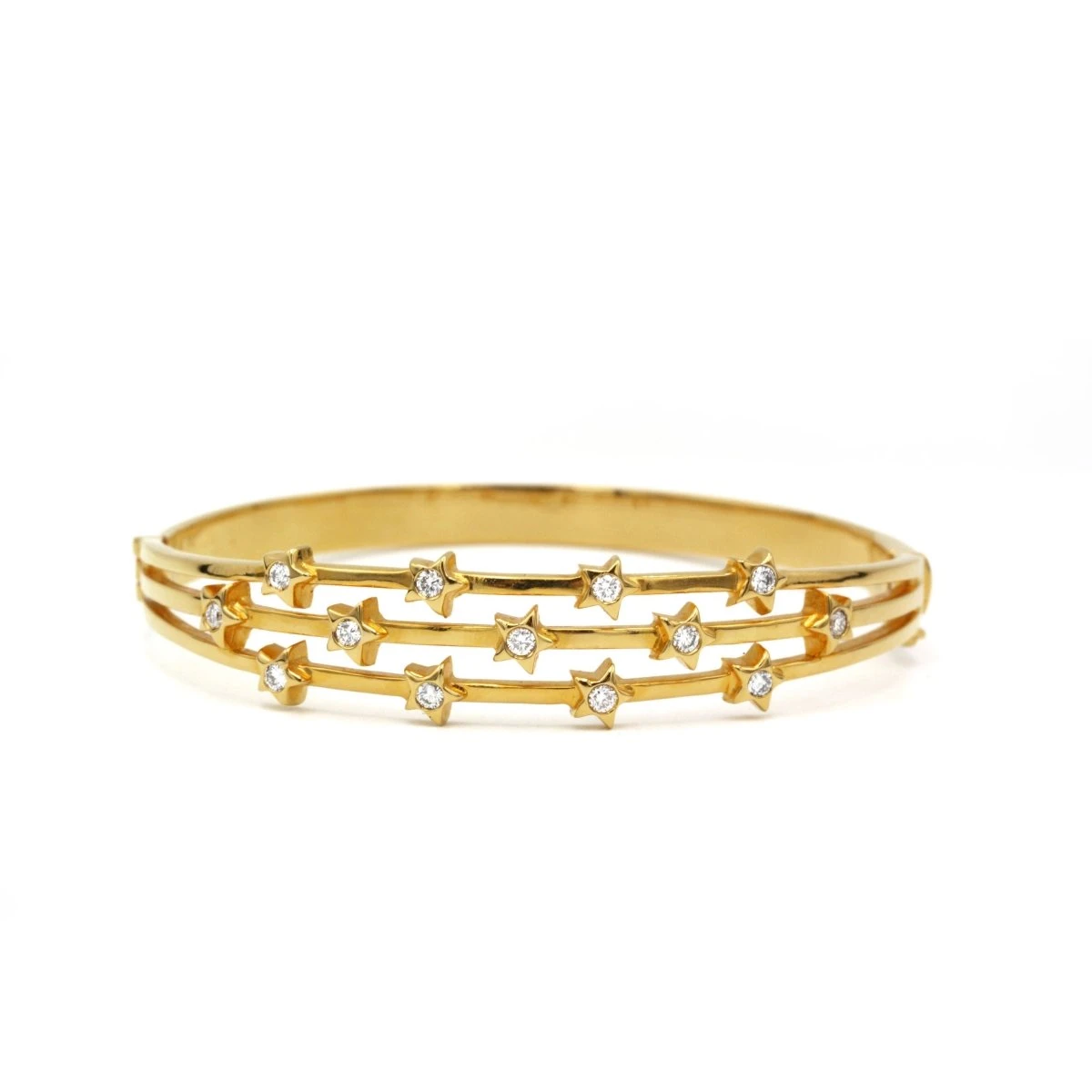 Bracelet rigide en or jaune 750‰, à motif de 13 étoiles, chacune sertie d’un diamant taille brillant de 0,02 carat environ, pour un total de 0,26 carats de diamants.