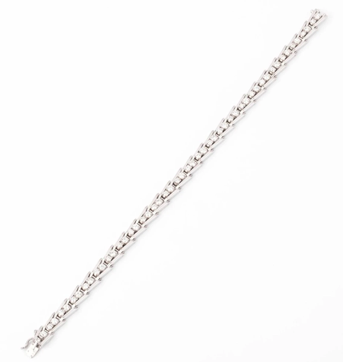 Matière : Or gris et platine Poinçon : tête de chien et tête d’aigle Poids : 25,5 grsLongueur :18 cmLargeur :0,5cmNombre carat: 1,60ctsNombre de pierres: 52Période: 1960