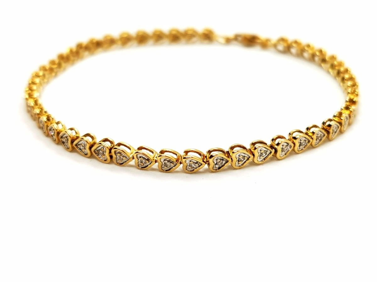 Bracelet ligne de diamants. en or jaune et or blanc 750 millièmes (18 carats). motifs coeurs. serti de 48 diamants. taille brillant. pour un total de 0.336 ct environ. longueur: 18 cm. largeur : 0.28 cm. poids total: 6.73 g. poinçon Hibou. excellent état.