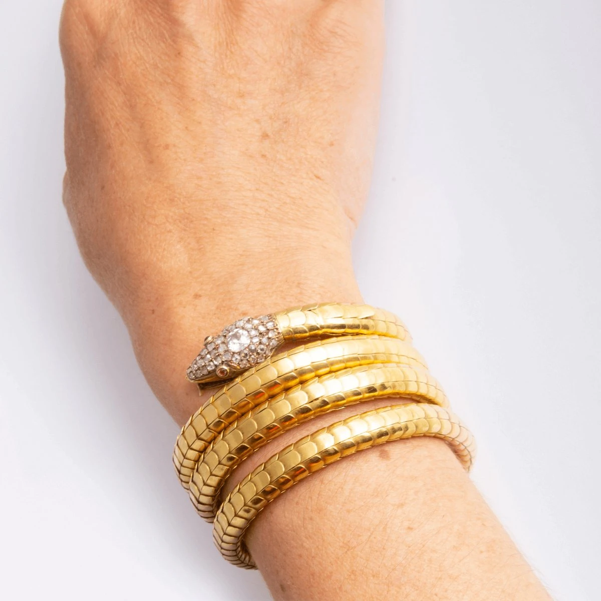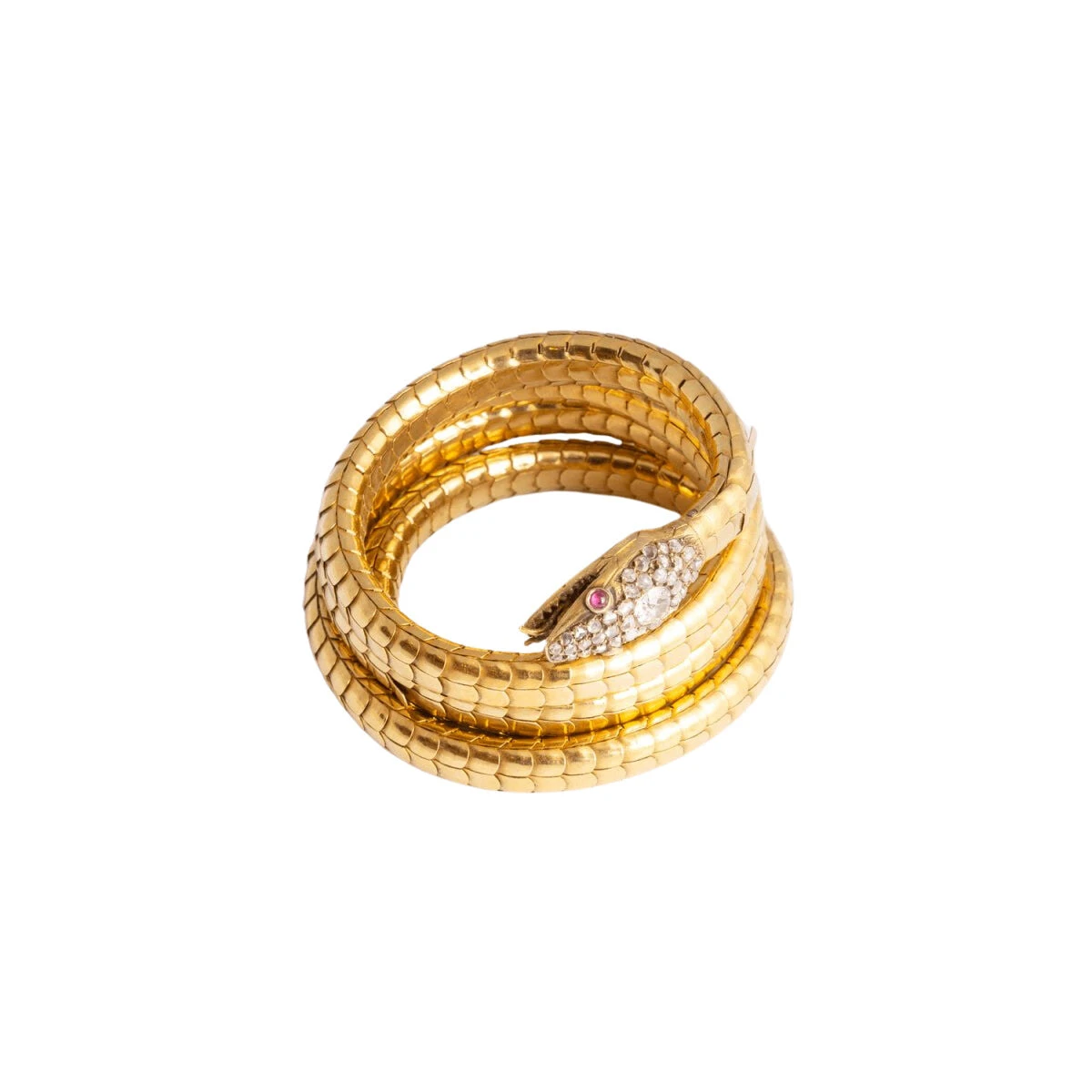 Bracelet de bras en or jaune 18 carats en forme de serpent, la tête sertie d’un diamant dans un entourage de diamants, les yeux sertis de rubis. Travail français du 19ème siècle.