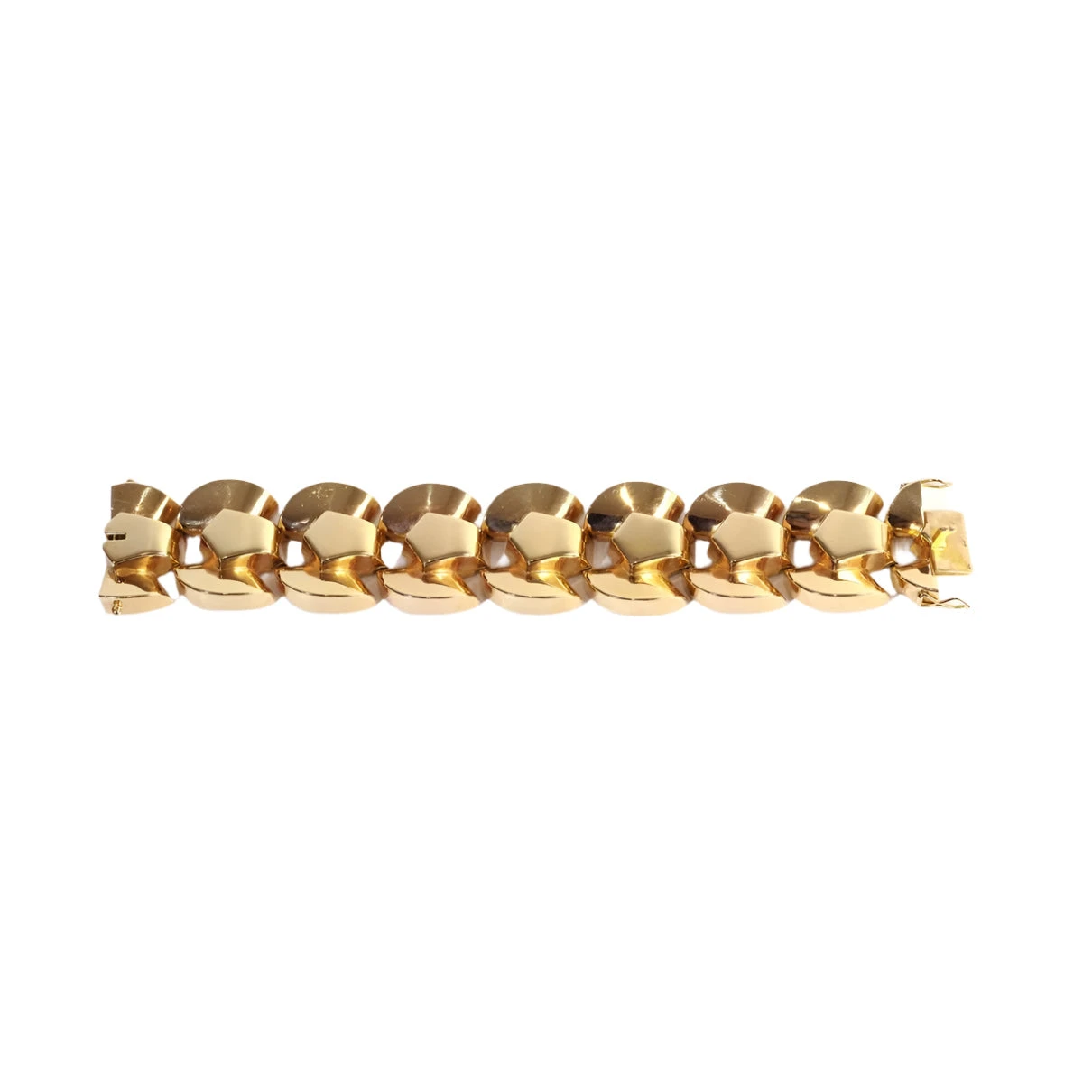 Bracelet Tank en or 18 karats (750 millièmes). Important bracelet tank aux lignes rondes, à fort volume, typique de cette période des années 40. Reflet d’une période où l’on concentrait ses économies dans des bijoux volumineux afin de pouvoir les emmener rapidement, les bijoux tanks tiennent leur nom des chaines utilisées pour les véhicules du même nom. Bracelet Tank des années 1940-1945, France.