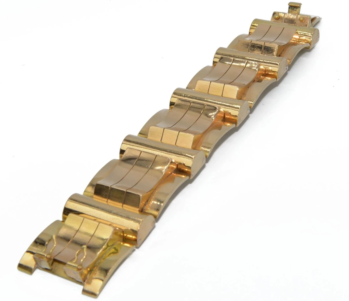 Bracelet Tank Ă©poque annĂ©es 1940-1950 en or rose et jaune,composĂ© d’une succession de très beaux motifs bombĂ©s ajourĂ©s.