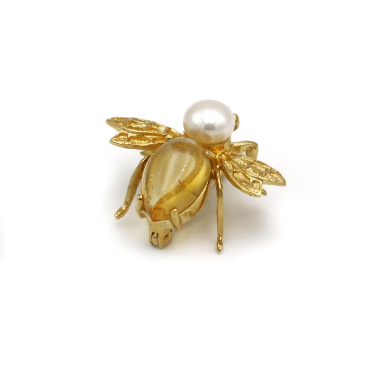 Broche en forme d’abeille en or jaune 750‰, sertie d’un cabochon de citrine en forme de poire et d’une perle blanche de culture.