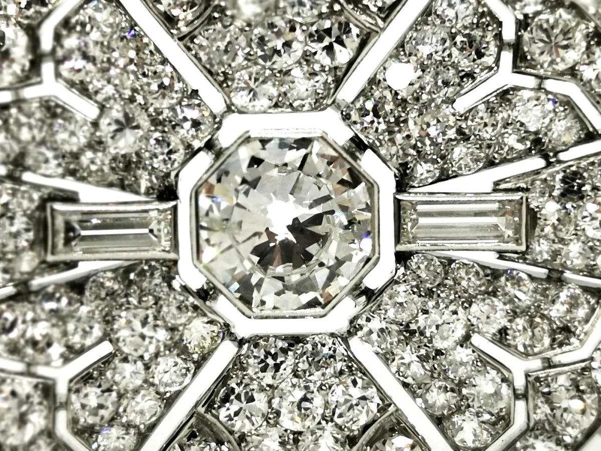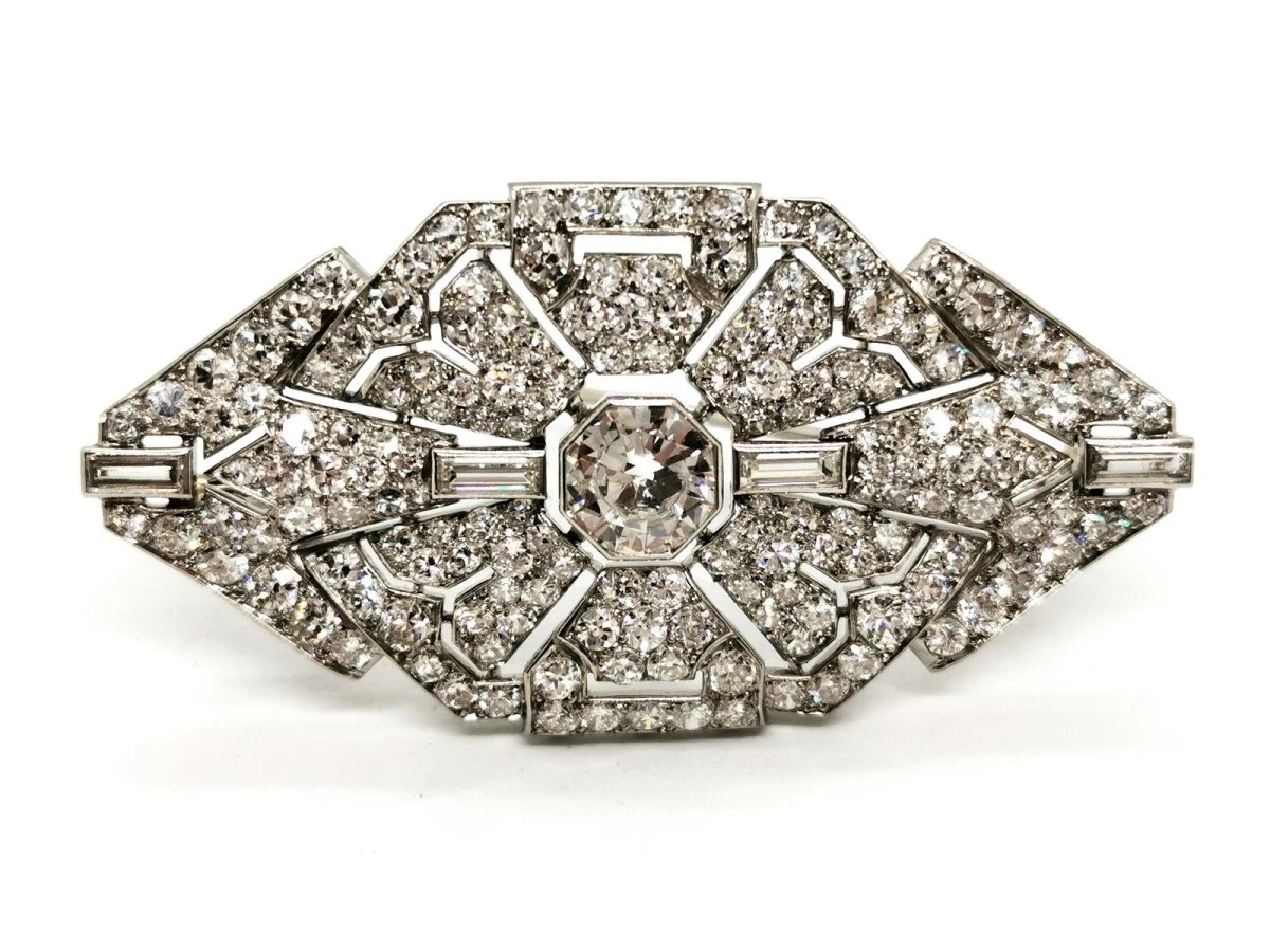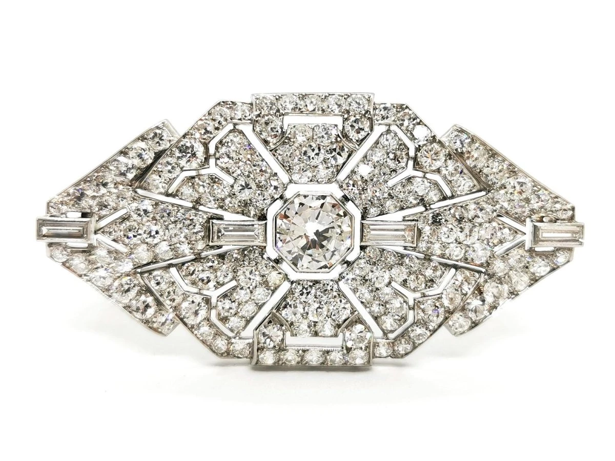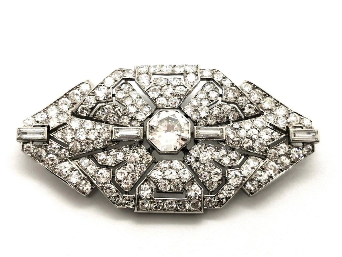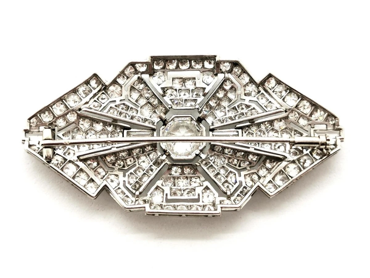 Broche Art déco en or blanc 750 millièmes (18 carats) et platine 950 millièmes. empierrée au centre d’un diamant taille ancienne d’environ 1.49 ct. épaulé de 4 diamants baguette d’environ 0.05 ct chacun. entouré de 166 diamants taille 8/8. (12 diamants 8/8 d’environ 0.07 ct chacun. 38 diamants 8/8 d’environ 0.03 ct chacun. 106 diamants 8/8 d’environ 0.012 ct chacun. et de 10 diamants 8/8 d’environ 0.0095 ct chacun). nombre total de diamants: 171. poids total diamants : 5.037 ct environ. dimensions : 2.80 cm X 5.54 cm. poids total: 14.78g. poinçon tête d’aigle et tête de chien. excellent état.