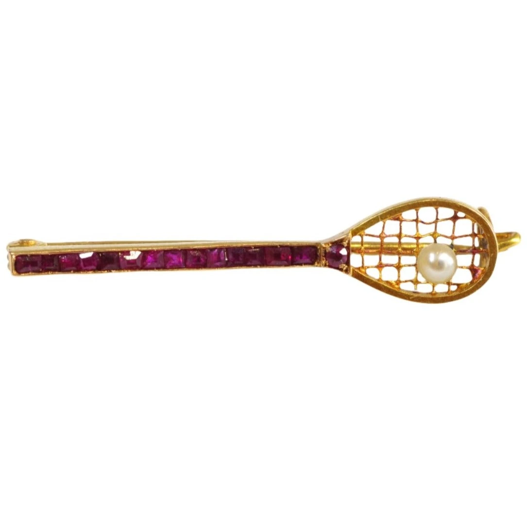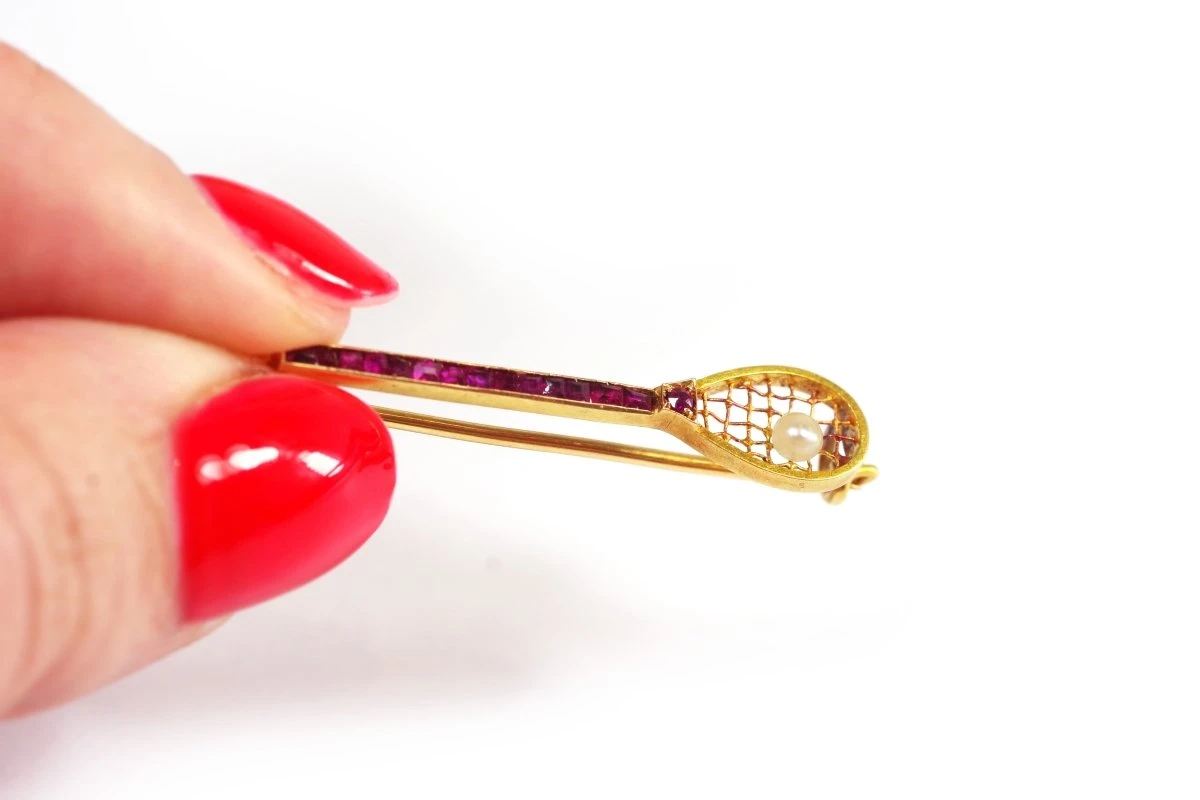 Broche Art Deco en or jaune 18 carats, en forme de raquette de tennis dont le manche est serti de 15 rubis calibrés et les cordes sont décorées d’une perle figurant la balle. Circa 1920.
