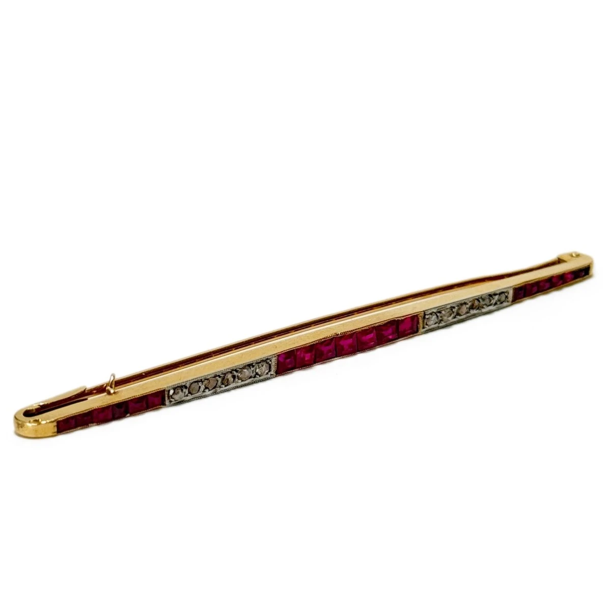 Fine broche barrette en or jaune et or blanc 18K sertie de petits rubis synthétiques calibrés alternés de diamants taille rose.