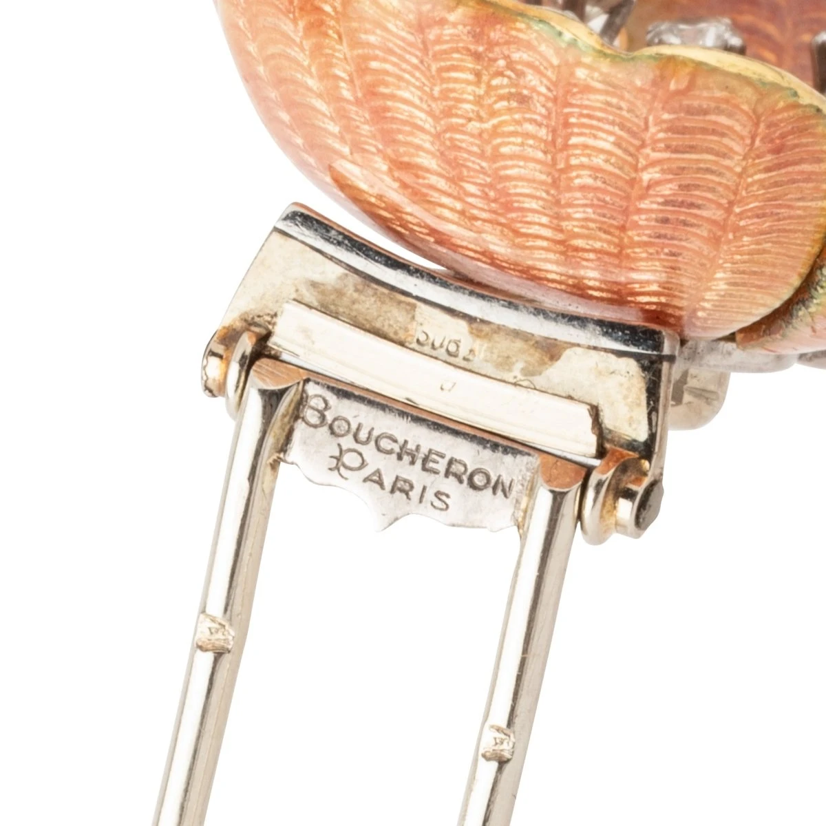 Broche BOUCHERON Eglantine en or blanc 18 carats , émail rose et diamants.