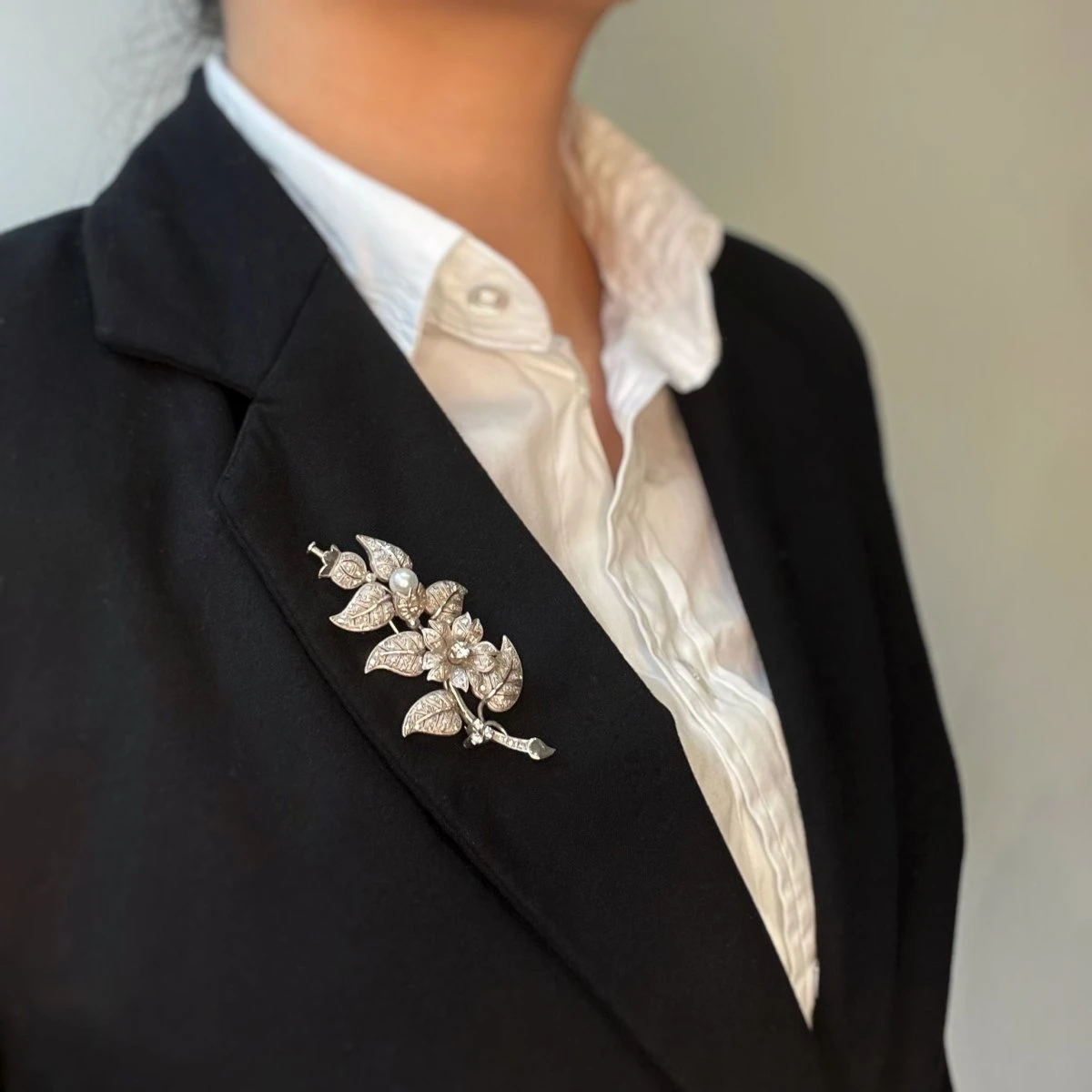 Broche représentant une branche florale en or blanc 750‰, sertie d’un diamant de 0,20 carat environ et d’une perle blanche. La fleur tourne. La broche est pavé de diamants taille rose.