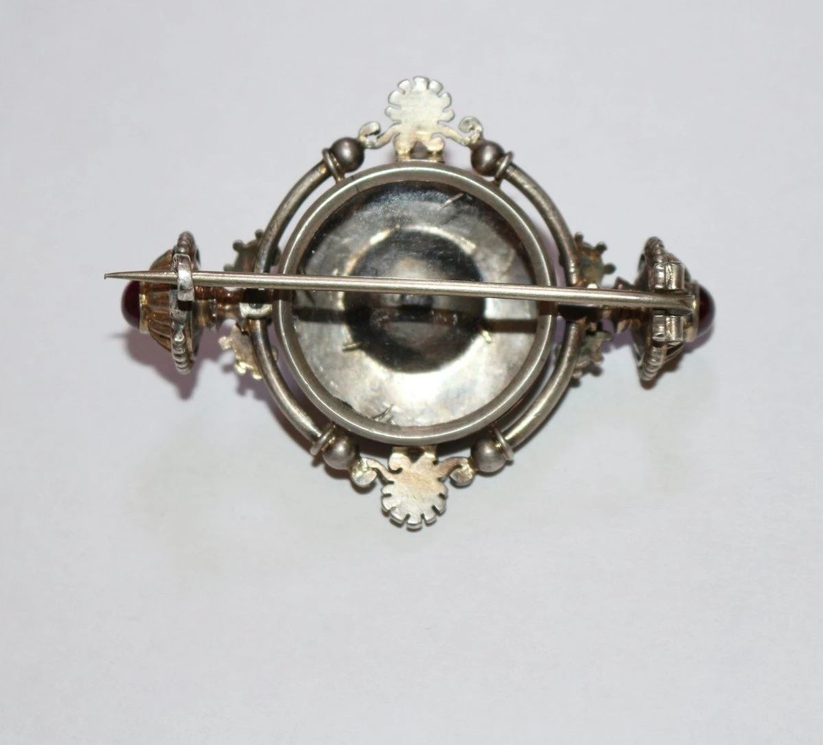Broche Camée en Clip en métal argenté et doré, émaillée bleu foncé, centrée d’une tête d’angelot de style Renaissance, présentant des extrémités stylisées d’arabesques et palmettes et de boutons sertis de cabochons de tourmaline. Au revers, petite vitre pour porte-souvenir.