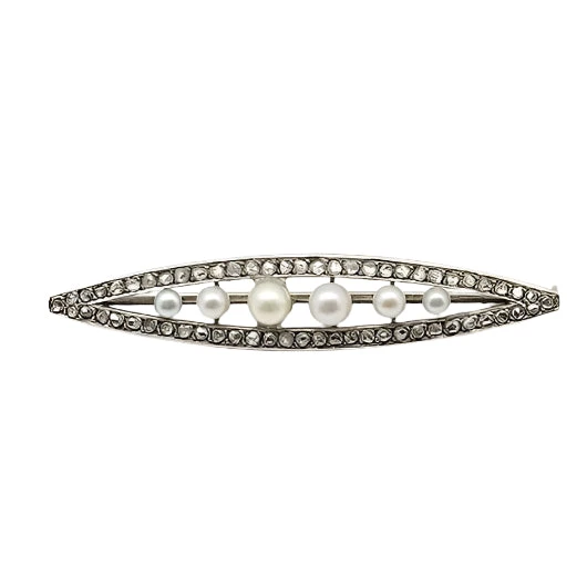 Broche du début XIXème en Or 750. sertie de diamants taille rose et de 6 perles blanches.