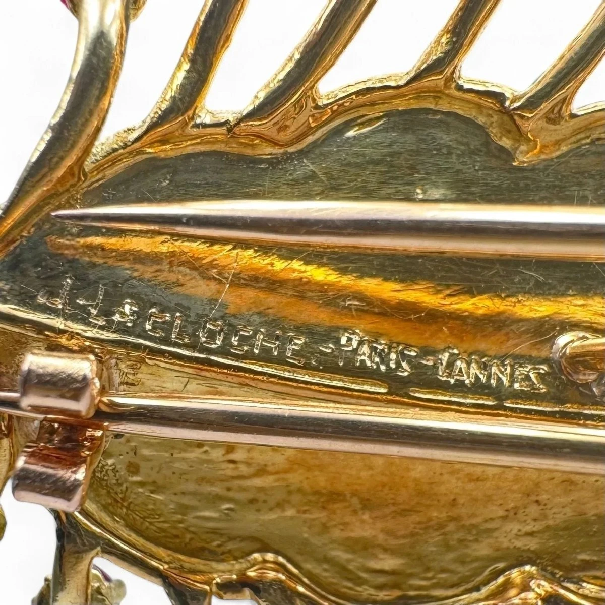 Broche en or jaune 750/000 en forme de feuille sertie de rubis. Signée J. LACLOCHE Paris – Cannes. Travail du maître joaillier français Antoine Maurice vers 1960.
