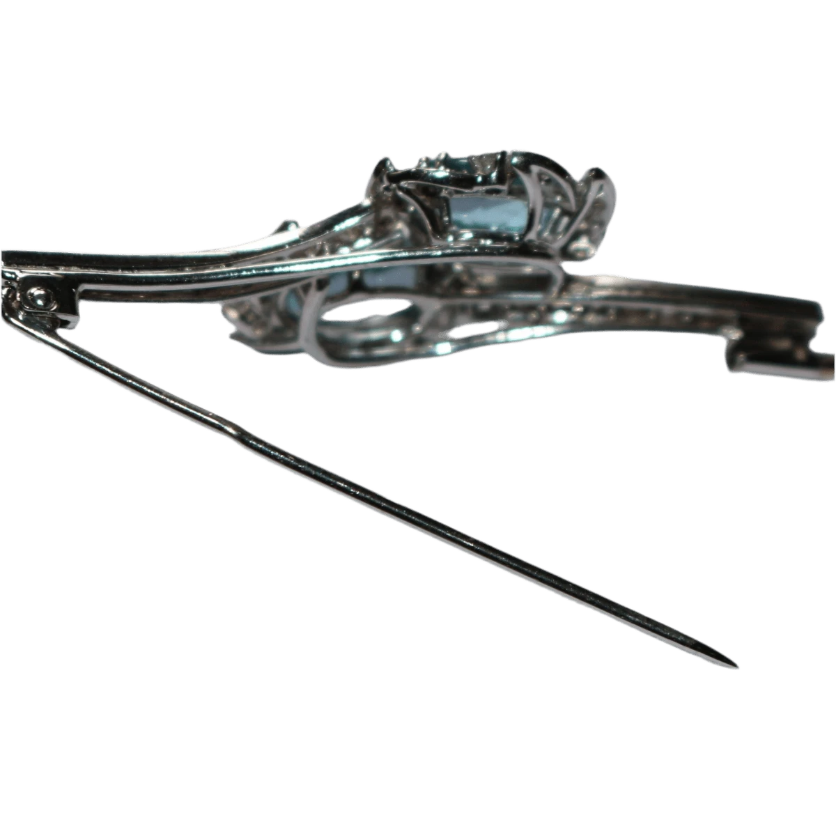 Boche rétro en or blanc 18 carats, ornée de deux aigues-marines facettées aux teintes douces et lumineuses 1,76 carat, serti de diamants taillés en brillant et en 8/8