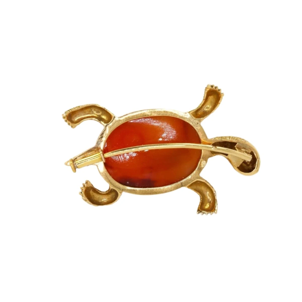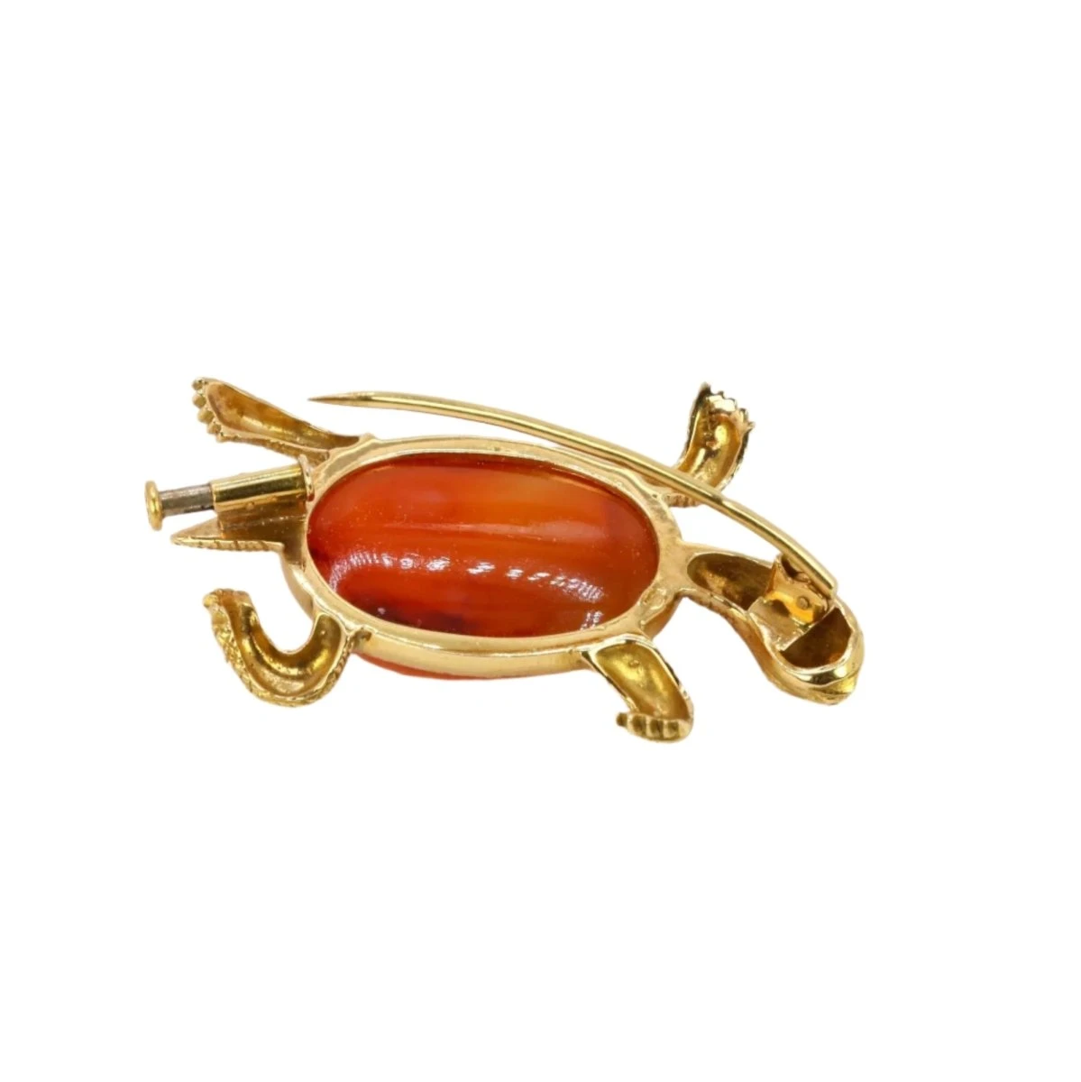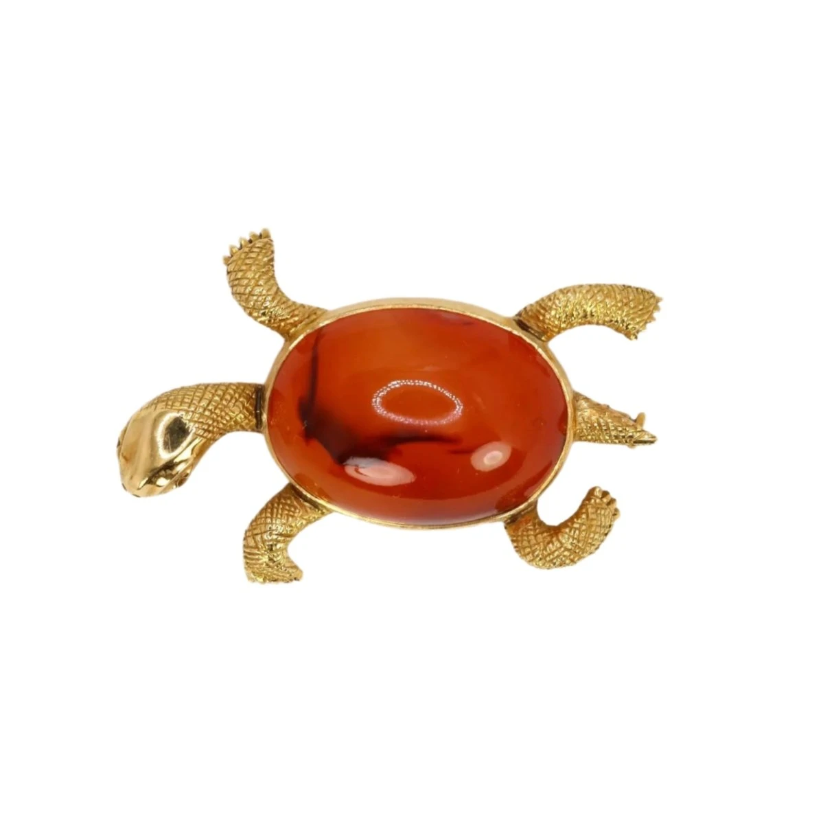 Broche Tortue en or jaune 18 carats, le corps de la tortue figuré par un important cabochon de cornaline, les pâtes et la tête de la tortue finement ciselées. Travail français, circa 1970.