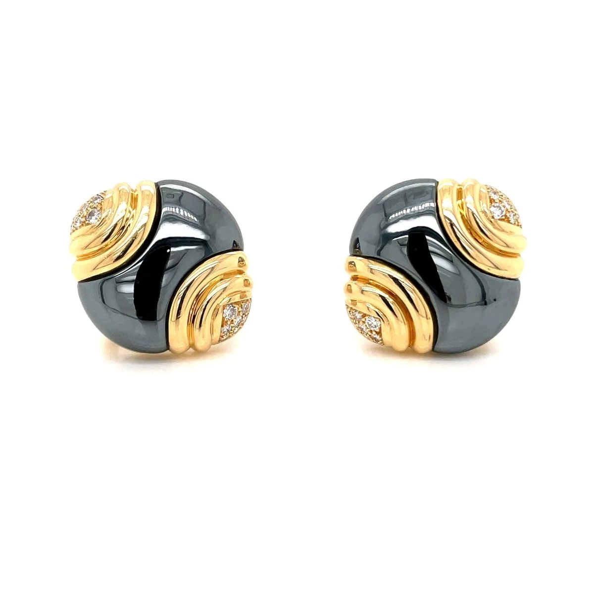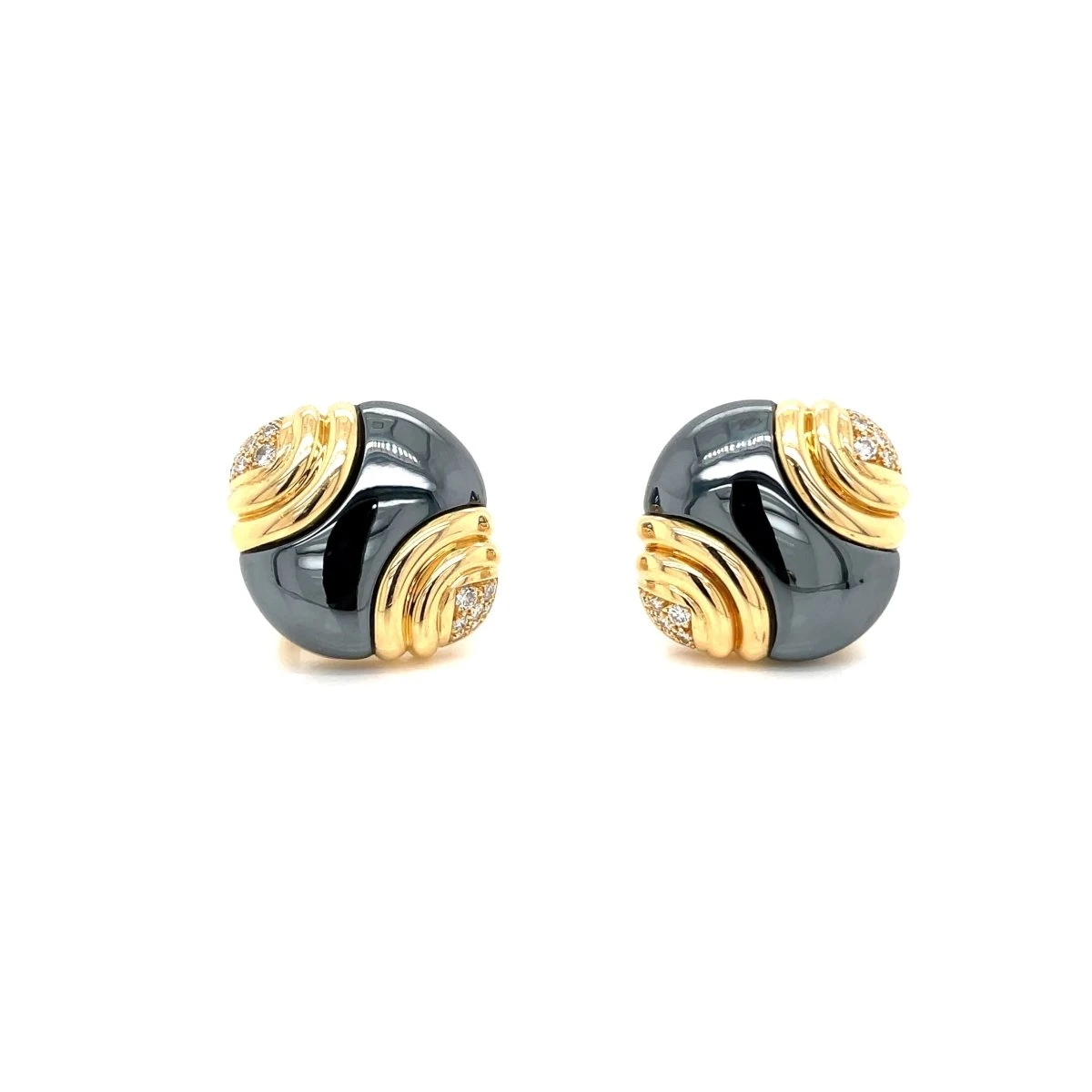 Iconic Bulgari design for these Bold rare earrings, designed and made in Italy in solid 18k yellow gold and black hematite, they feature sparkling colorless round brilliant cut diamonds at the two groove designed sides. Made in Italy, circa 1980