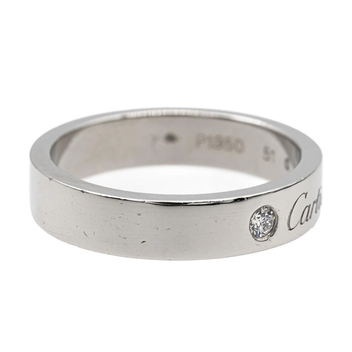 Alliance signée de la Maison Cartier. modèle Le C de Cartier. en platine 950 millièmes. sertie d’un diamant taille brillant. d’un poids d’environ 0.03 ct. largeur sur le dessus: 0.40 cm. tour de doigt: 51. poids total: 6.77 g. poinçon tête de chien. excellent état