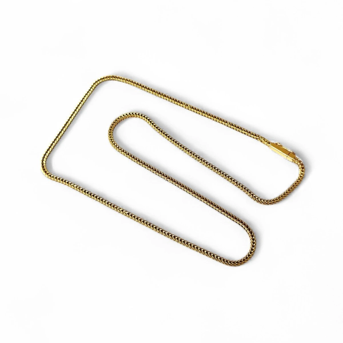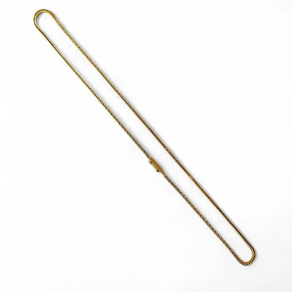 Jolie chaine en or jaune 18 carats à maille ronde palmier, assez courte qui tombe parfaitement dans le creux du cou. Fermoir à lame avec huit de sécurité.