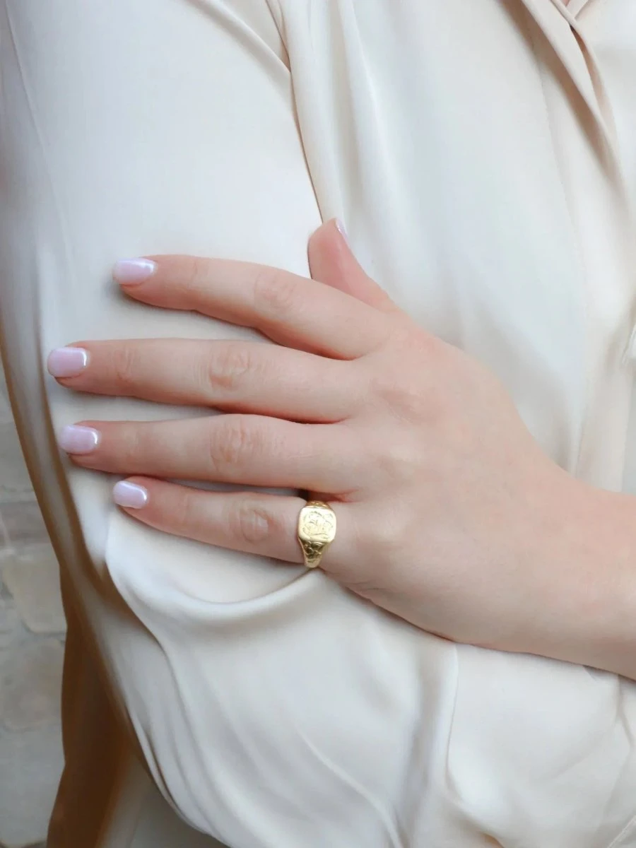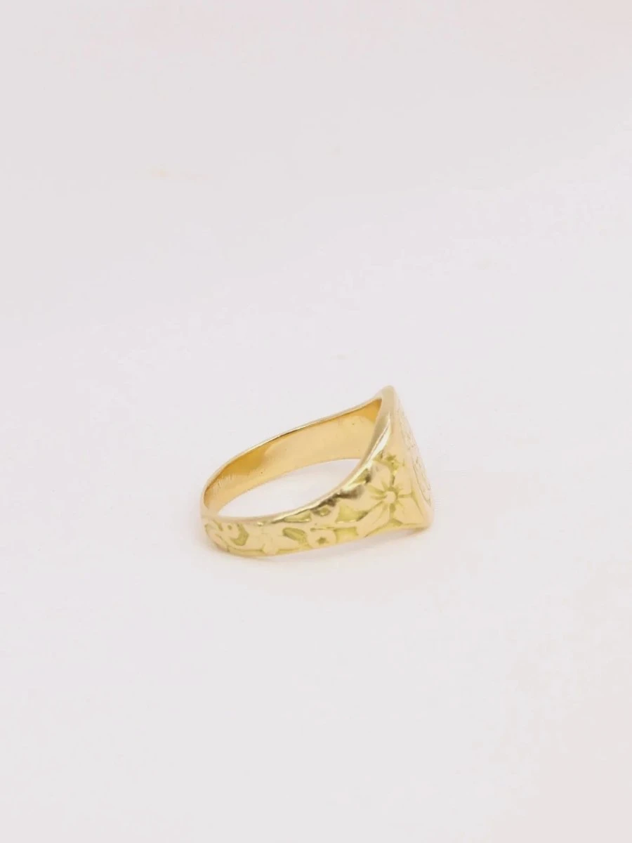 Bague chevalière en or 18k (750°/°°), l’anneau décoré d’un motif floral typique de l’art nouveau et le chaton gravé des initiales C P ou E P stylisées. Travail français Art-Nouveau circa 1900. A noter que le motif fleuri qui décore l’anneau est légèrement effacé par endroit.