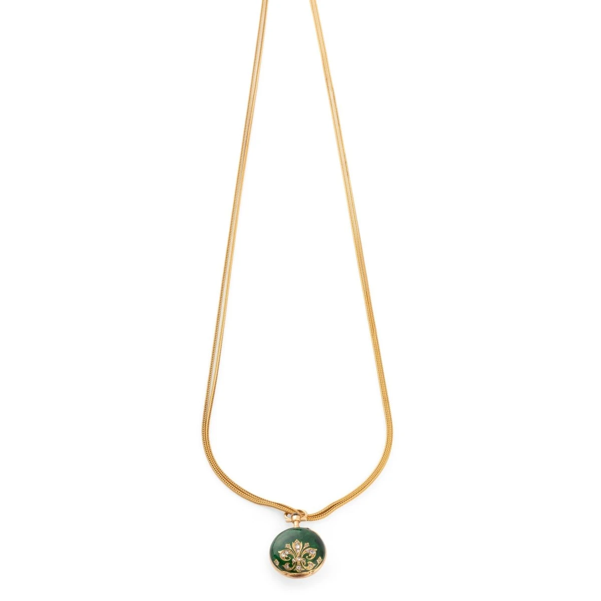 Collier Sautoir avec montre gousset en or jaune 18 carats, émail vert orné de diamants.