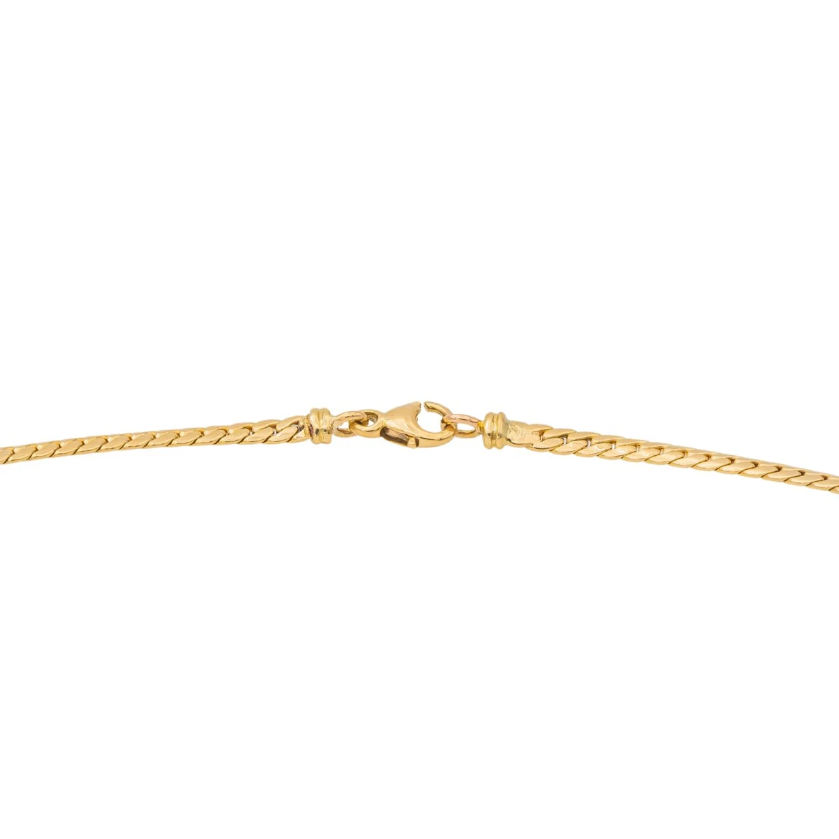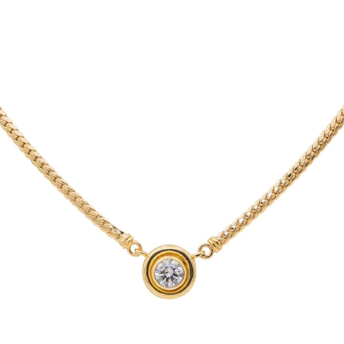 Collier en or jaune 750 millièmes (18 carats). serti clos d’un diamant. taille brillant.poids total : 0.81 ct. maille anglaise. longueur : 46 cm. largeur : 0.254 cm. poids total : 16.96 g. poinçon tête d’aigle. excellent état