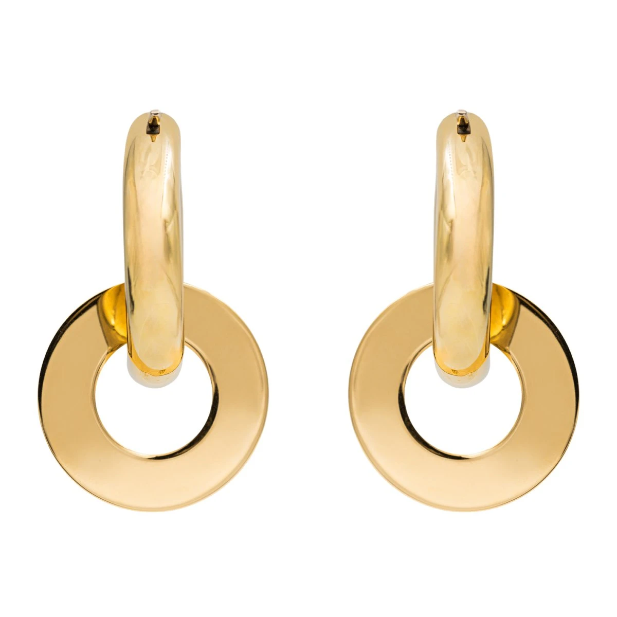 Créoles en or jaune 750 millièmes (18 carats). fil rond. diamètre: 2.38 cm. largeur: 0.49 cm. cercle en or amovible sur chaque créole. diamètre: 2.00 cm. largeur: 0.52 cm. Longueur totale: 3.42 cm. poids total: 7.74 g. excellent état