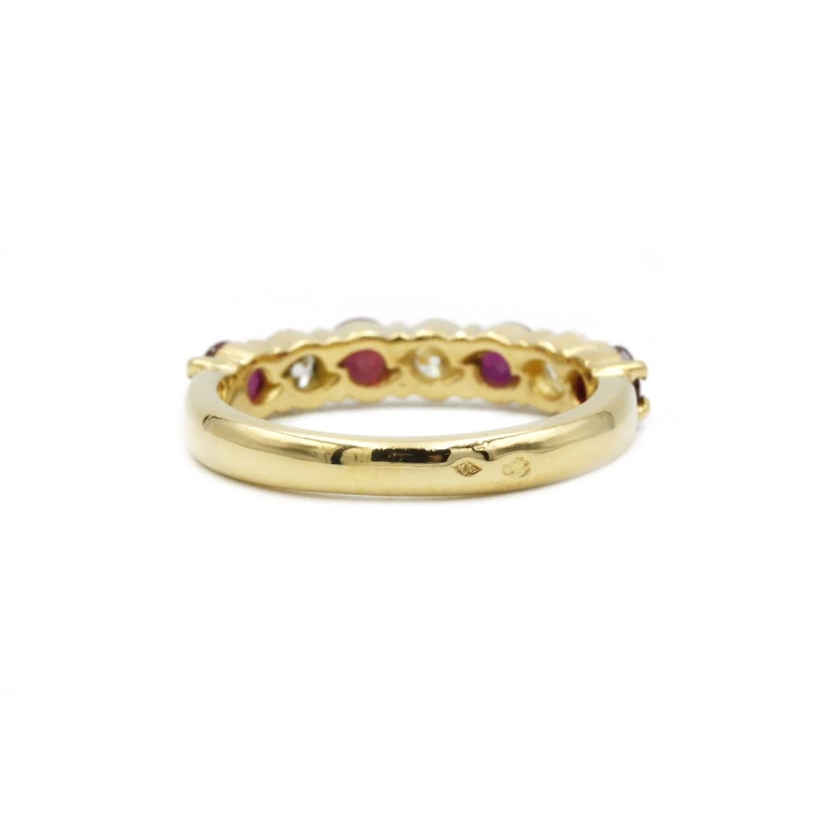 Demi alliance en or jaune 750‰, sertie de 3 diamants (0,50 carat) et de 4 rubis (1,10 carats).
