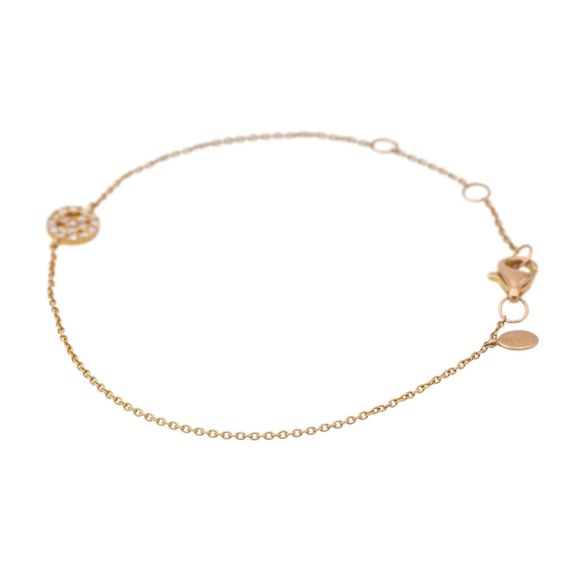Bracelet signé de la Maison Djula. or rose 750 millièmes (18 carats). motif Peace & Love. serti de 17 diamants taille brillant. d’un poids total d’environ 0.085 ct. (chaque diamant d’un poids d’environ 0.005 ct). maille forçat. longueur : 17.00 cm. largeur du motif : 0.06 cm. poids total : 1.11 g. excellent état