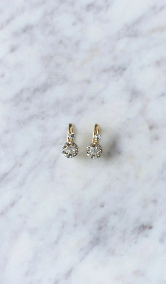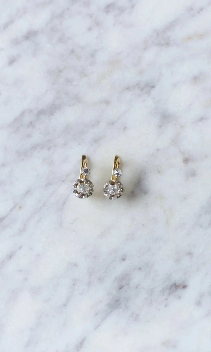 Boucles d’oreilles dormeuses en or jaune 18kt et platine (poinçon: tête d’aigle) ornées de diamants taillés à l’ancienne, pesant au total environ 0.50 Ct (couleur estimée H et K, pureté estimée SI), surplombées de diamants taillés en rose.