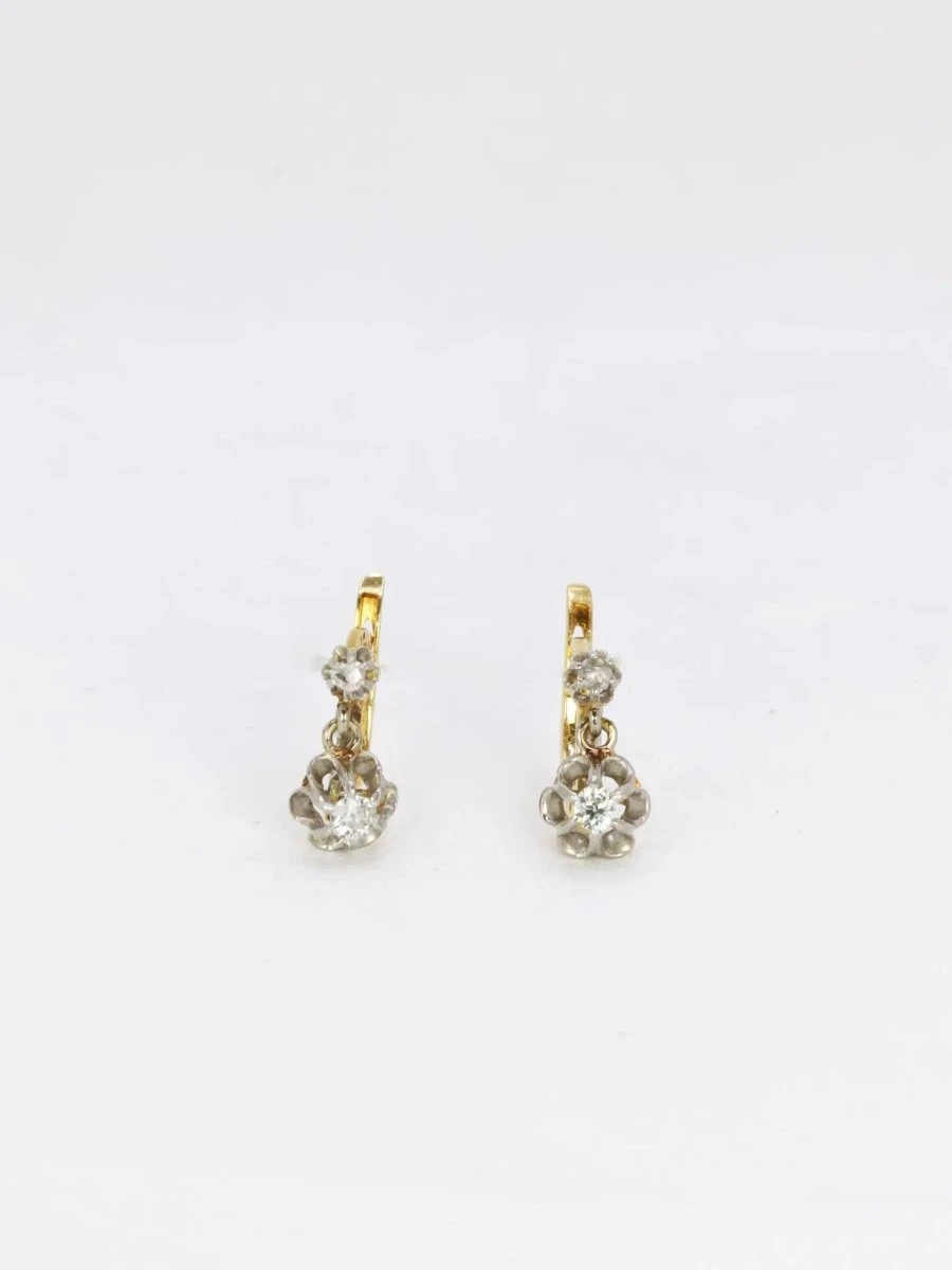 Paire de boucles d’oreilles dormeuses en or 18k (750°/°°) composée d’un chaton mobile serti d’un diamant rond taille ancienne (Old European Cut) pesant environ 0,10ct de belle couleur et sans inclusions visibles à l’oeil nu surmonté d’un diamant taille ancienne plus petit. Travail français du début du XXe siècle. Poinçon tête de cheval pour les ouvrages fabriqués en dehors de paris entre 1838 et 1919.