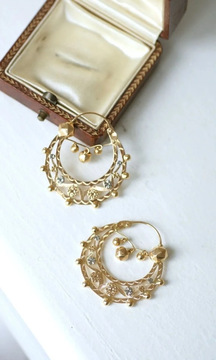 Paire de pendants d’oreilles, dites créoles Savoyardes ou Tarentaises, en or jaune et or blanc 18kt (poinçon: tête d’aigle) finement ciselées, à décor de fleurs, ornées de pendeloques facettées.
