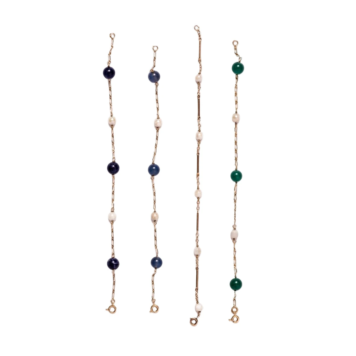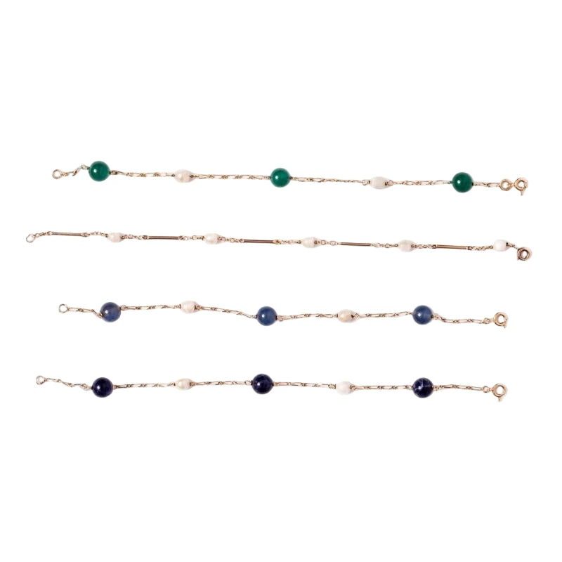 Bracelets en or jaune 18 carats à maille gourmette allongée, ornés de perles de culture, billes de lapis lazuli, bille de chrysoprase et billes de calcédoine.