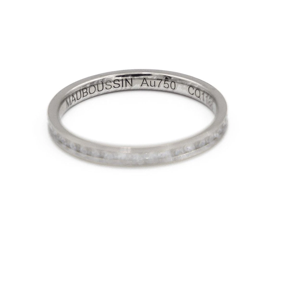 Alliance signĂ©e de la Maison Mauboussin en or blanc 750 millièmes (18 carats). Modèle Parce que je l’aime. Tour complet de 40 diamants taille brillant environ 0.005 ct chacun. Poids total des diamants: 0.20 ct. Tour de doigt: 53. Largeur sur le dessus: 0.20 cm. Poids total: 1.93 g. Poinçon tĂŞte d’aigle. Excellent Ă©tat