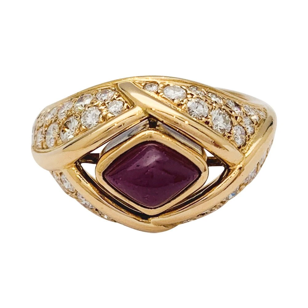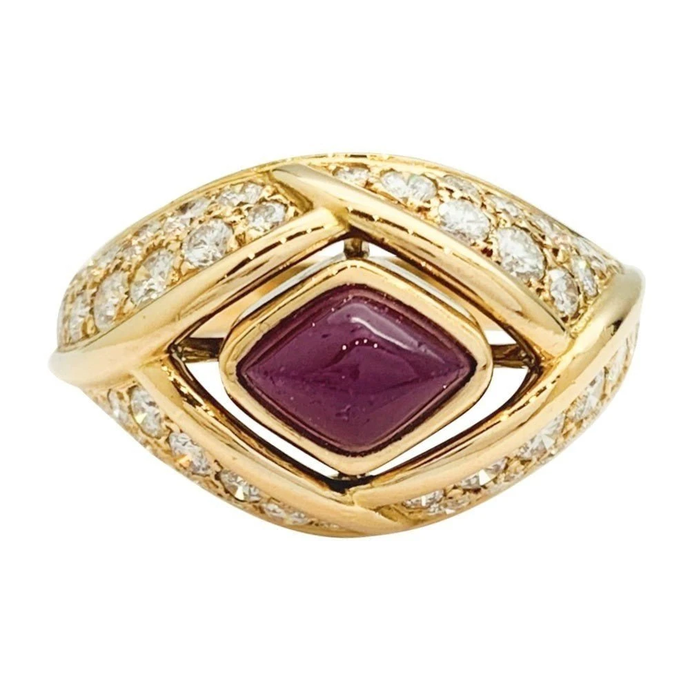 Une bague signée de la Maison Cartier en or jaune 750/000, dôme, centrée d’un rubis taille pain de sucre en serti clos et ajouré, la monture est rehaussée de diamants taille brillant.