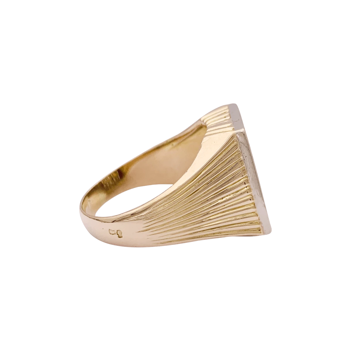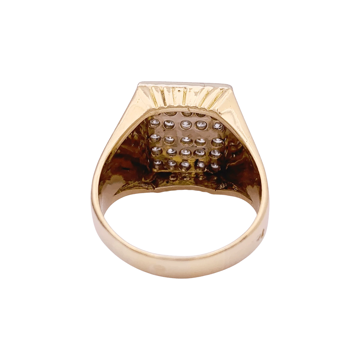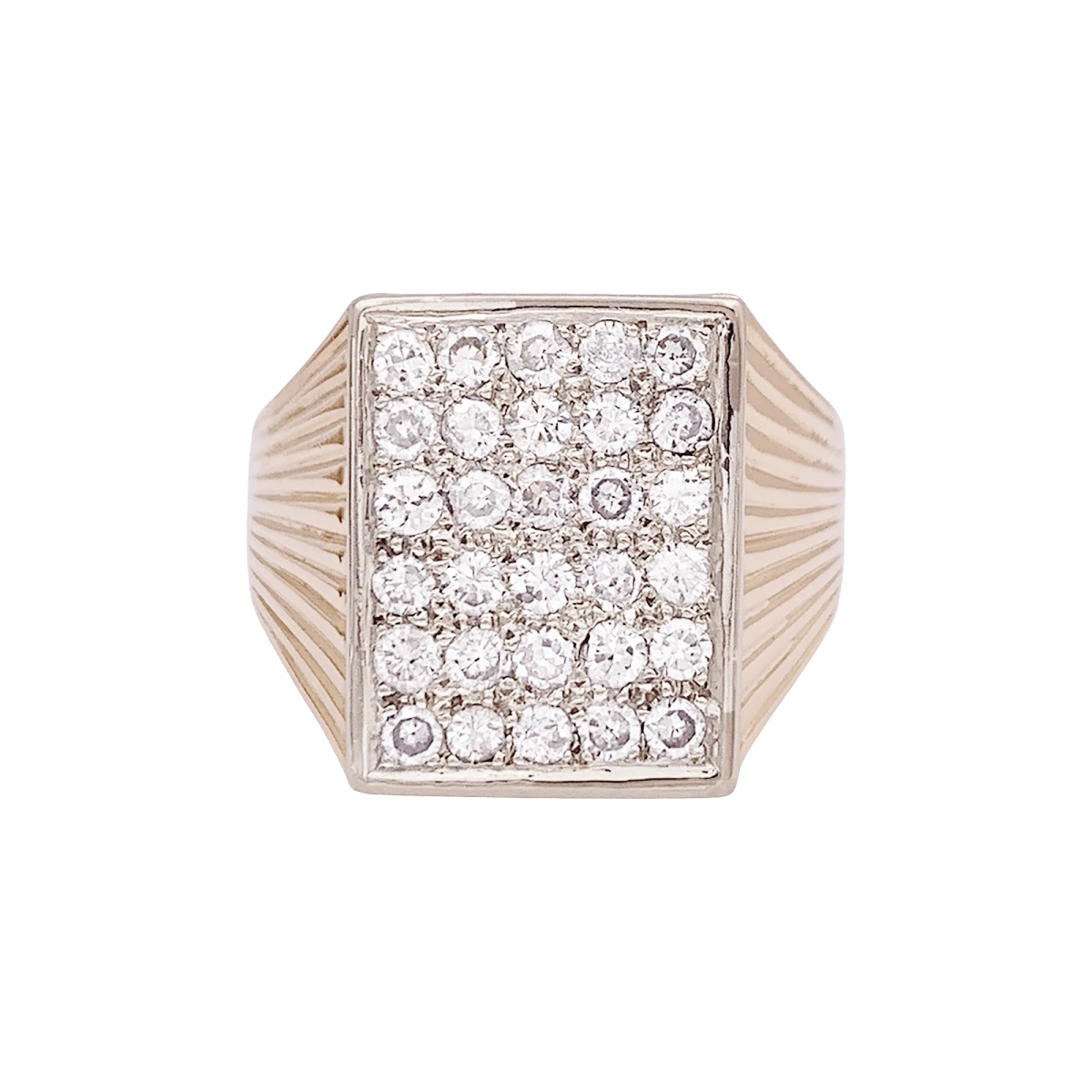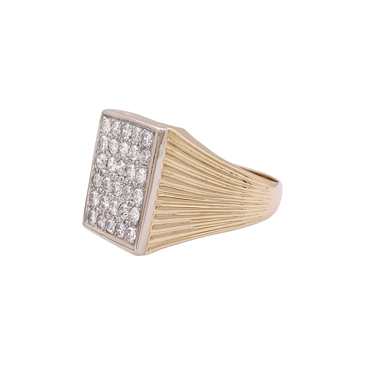 Bague chevalière en or jaune et or blanc 18 carats à décor ciselé rayonnant, retenant un plateau rectangulaire pavé de diamants taille brillant.