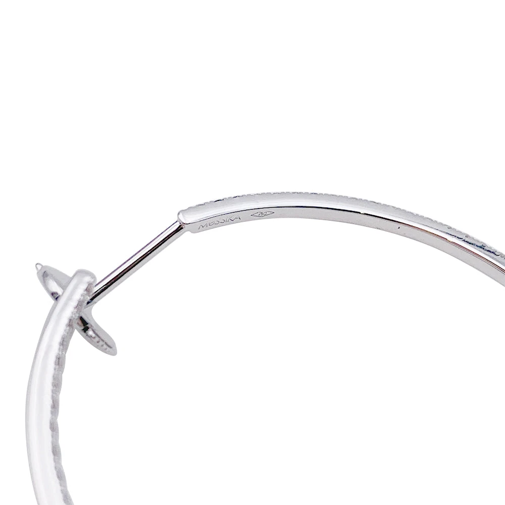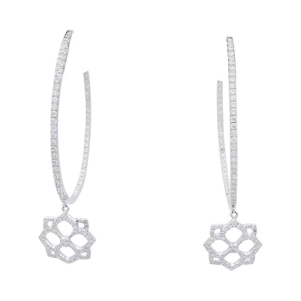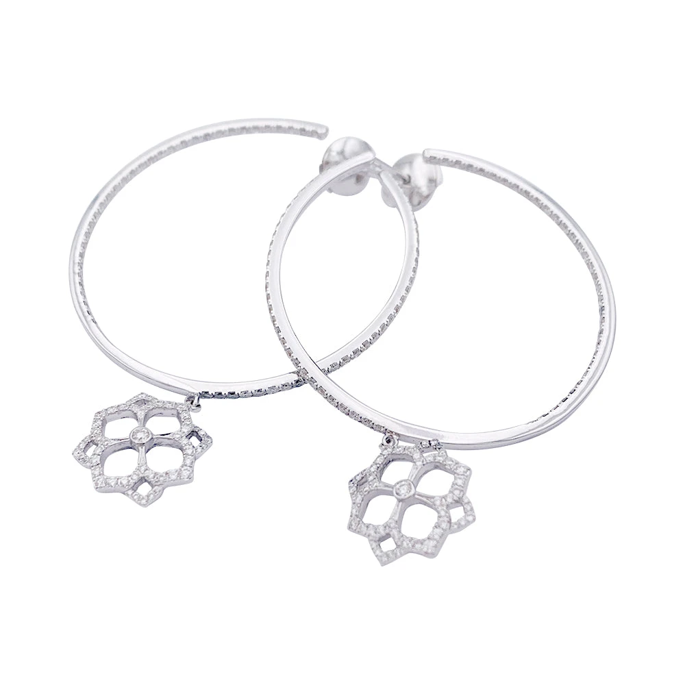 Boucles d’oreilles créoles signée MESSIKA, collection “Eden”, en or blanc 18 carats retenant un motif fleur ajourés. La créole et le motif sont sertis de diamants taille brillant.
