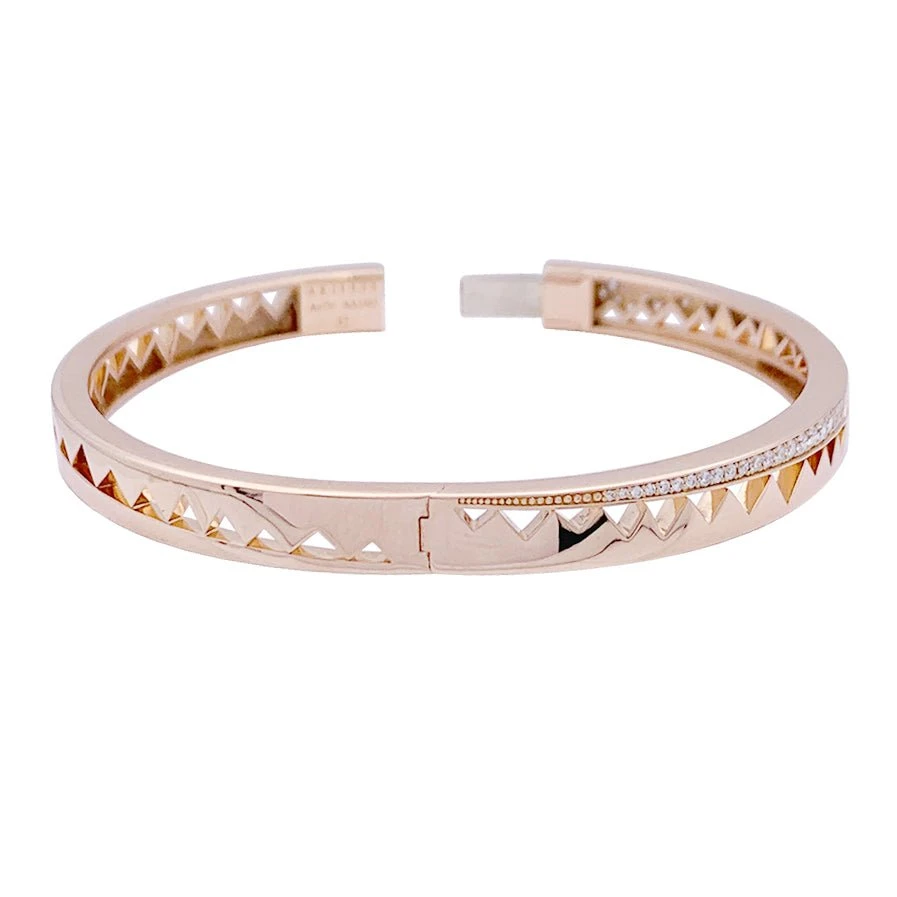 Bracelet Jonc AKILLIS, collection “Capture Me”, en or rose 18 carats partiellement serti de diamants taille brillant présentant un motif ajouré de triangles asymétriques.