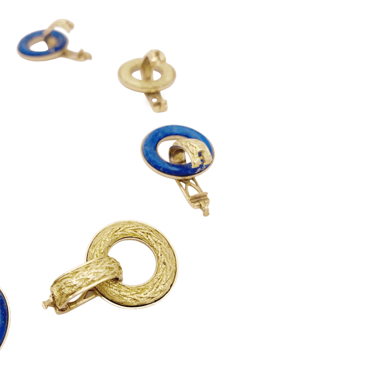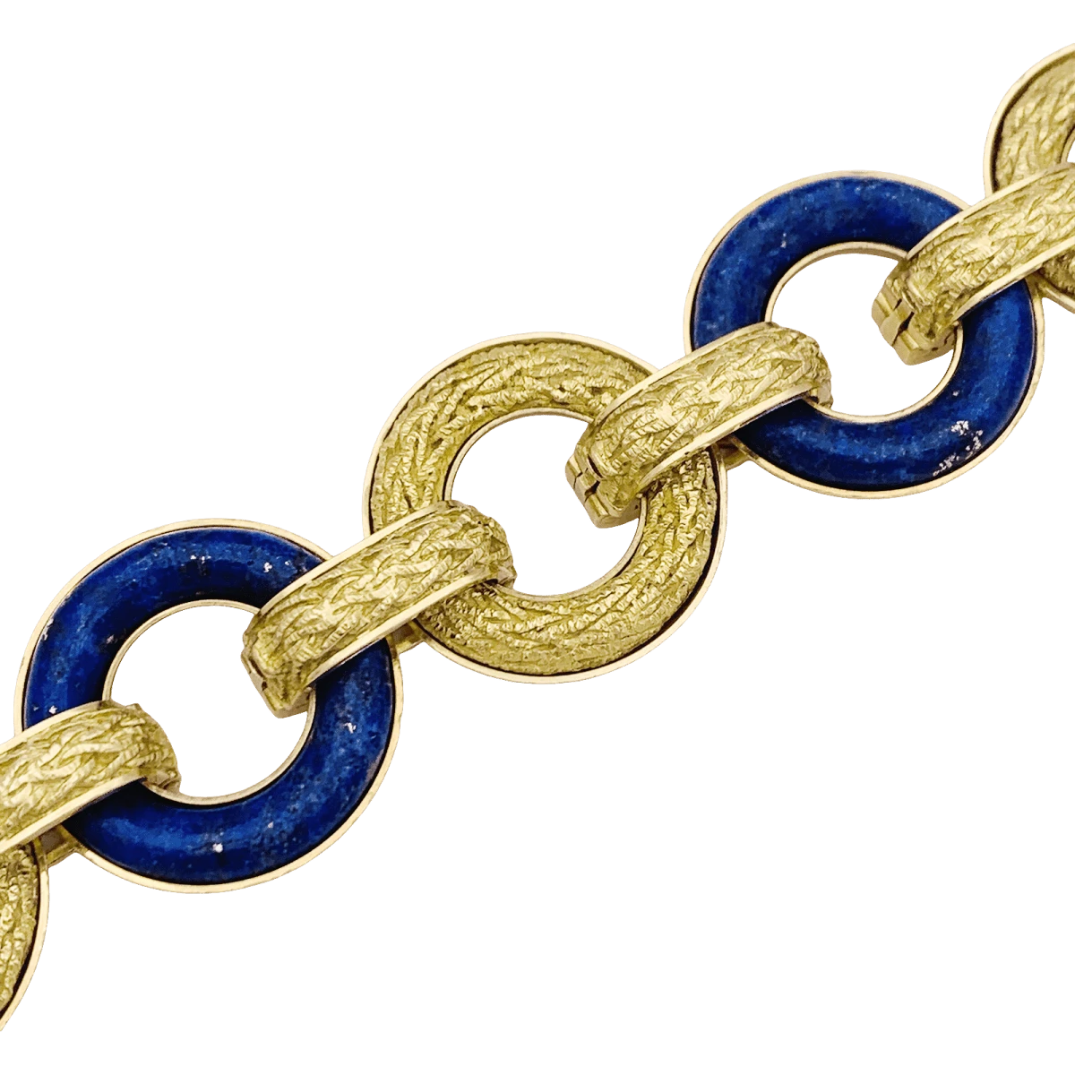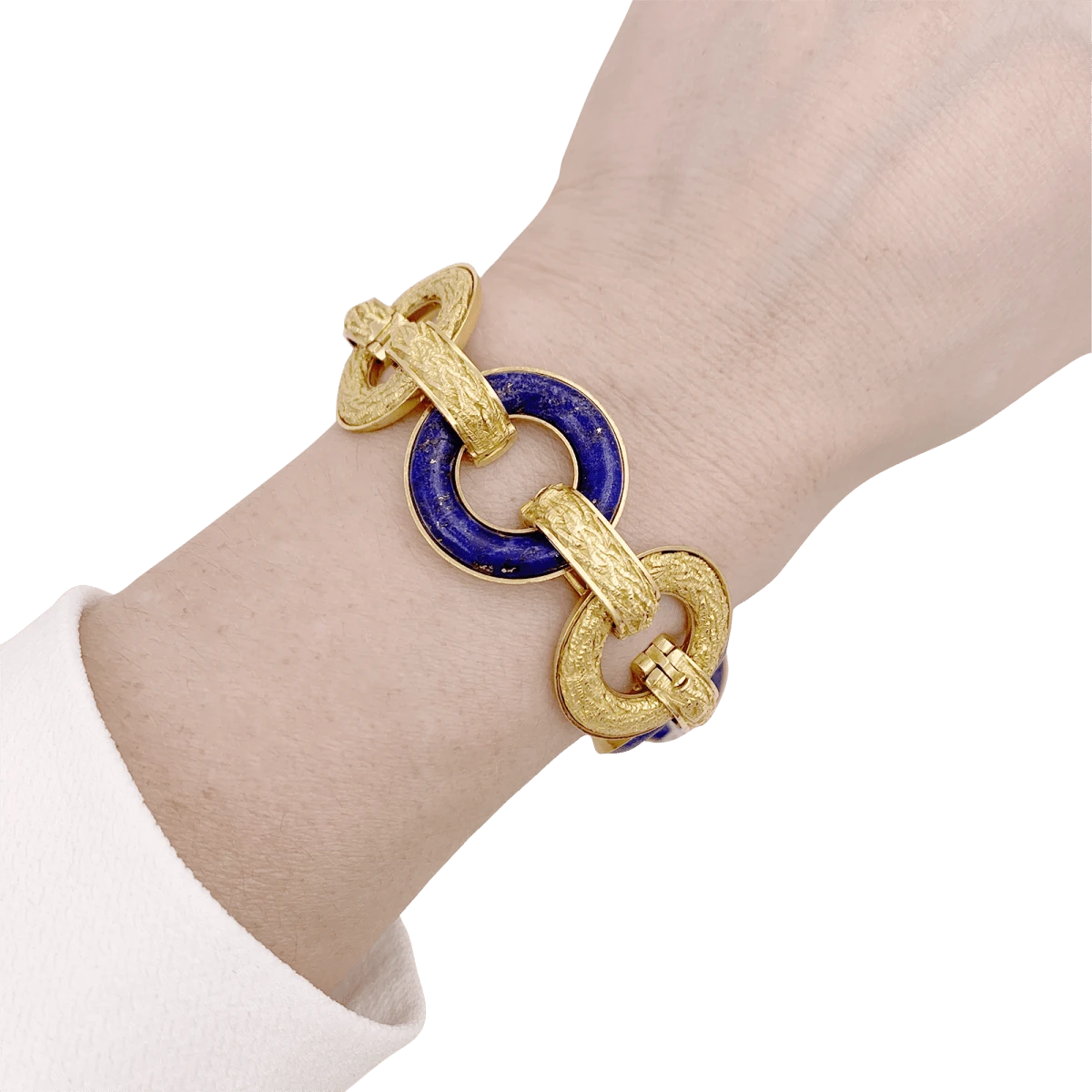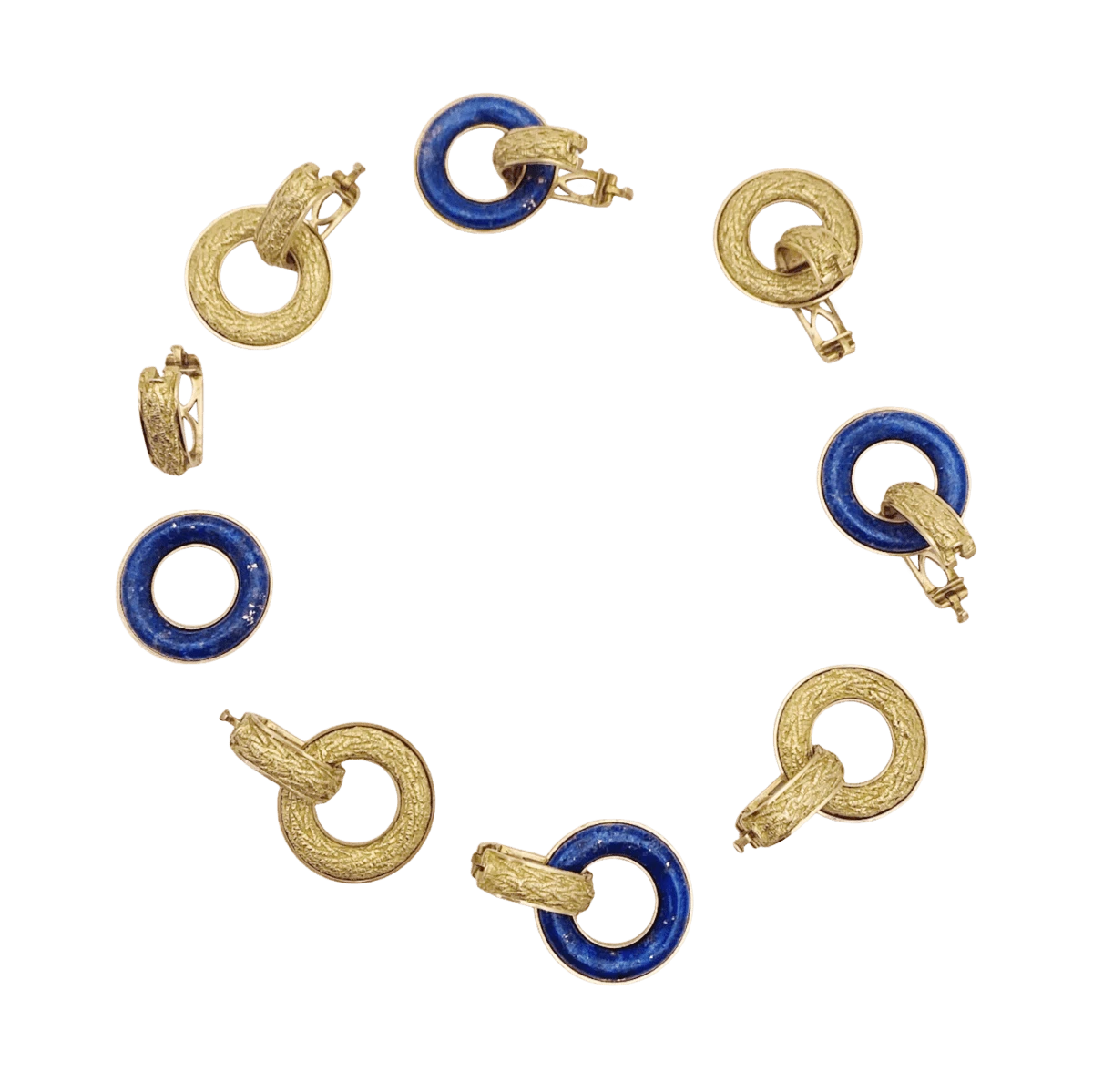 Bracelet articulĂ© composĂ© de 8 anneaux en or jaune 18 carats alternĂ©s d’anneaux appliquĂ©s d’un disque de lapis lazuli.