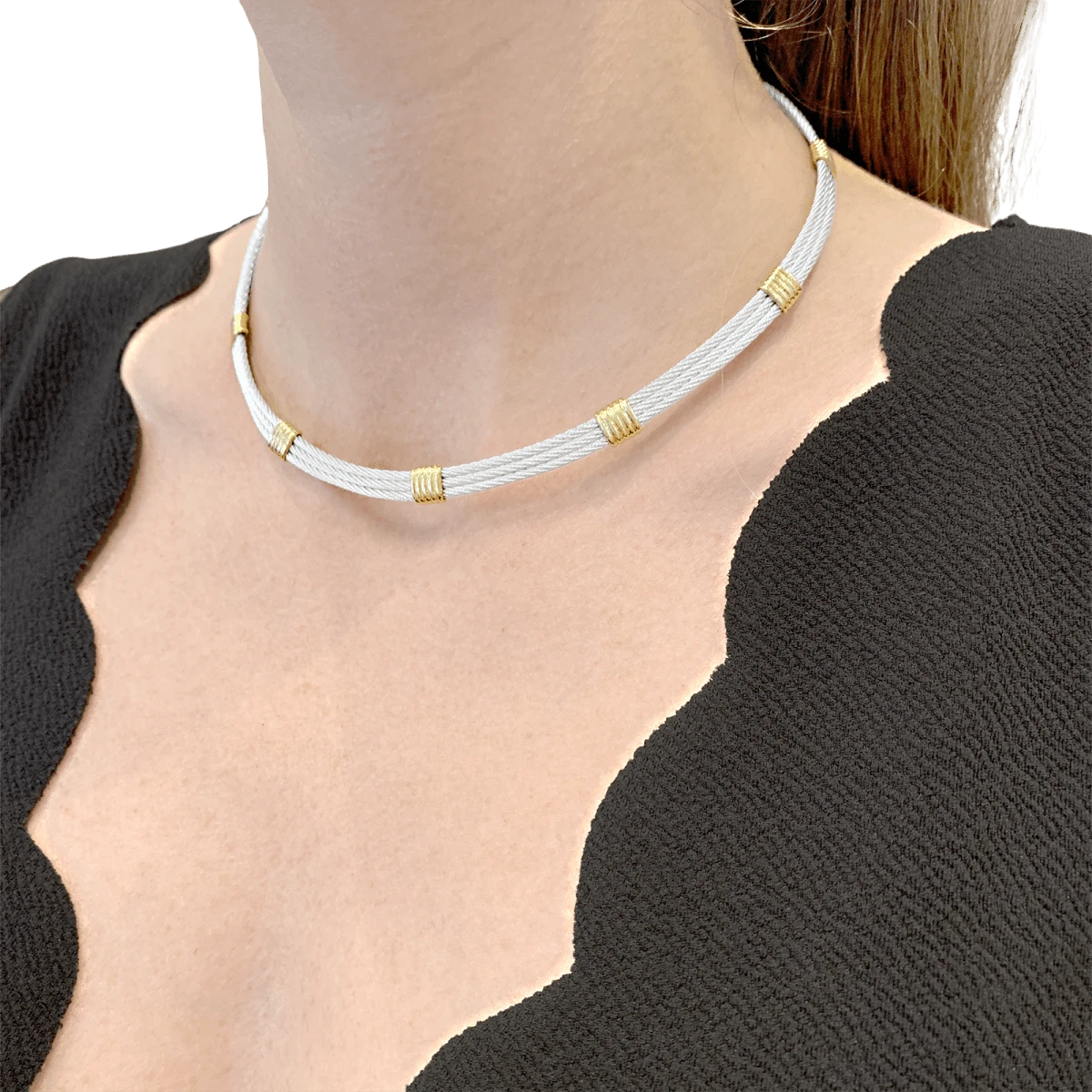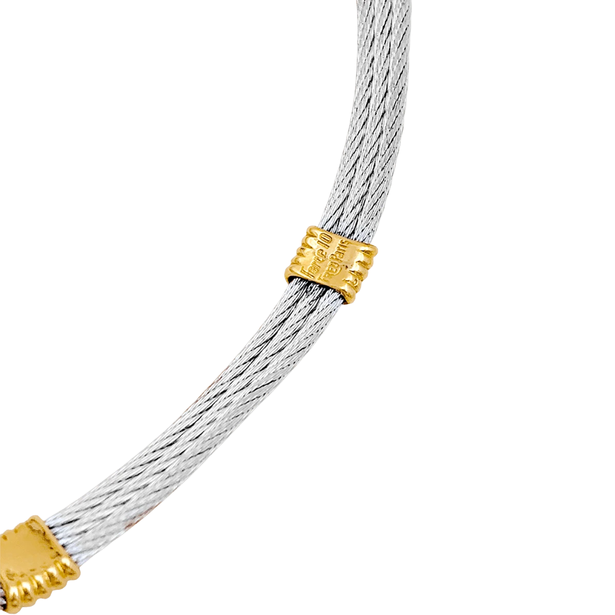 Collier Torque FRED collection « Force 10 » en or jaune 18 carats et composé de 3 câbles en acier torsadé ponctué de 7 motifs godronnés. Fermoir mousqueton