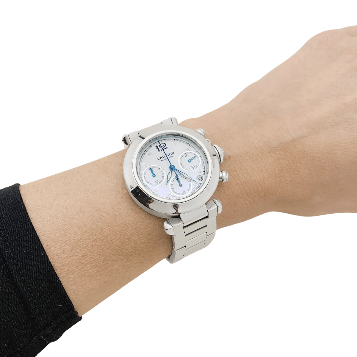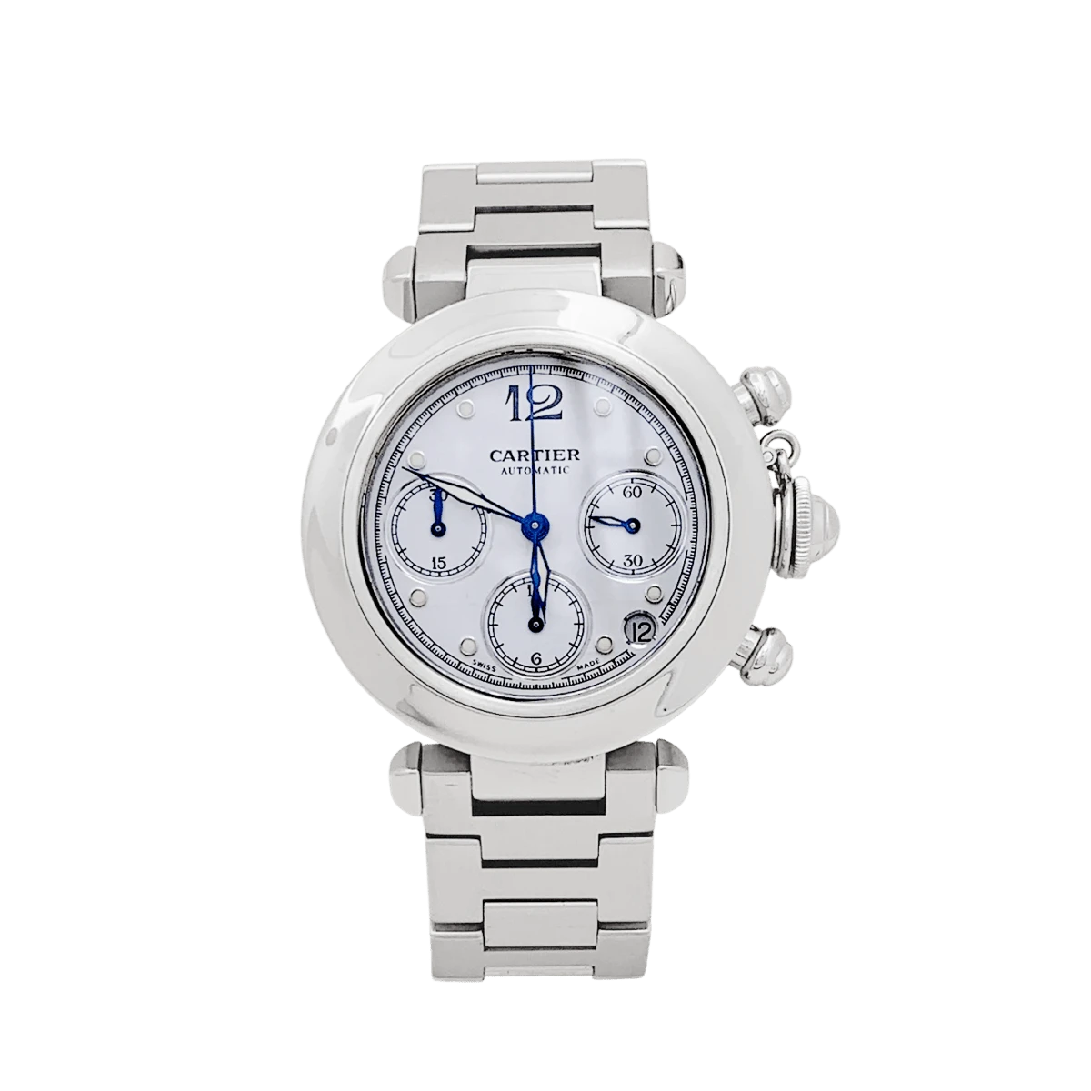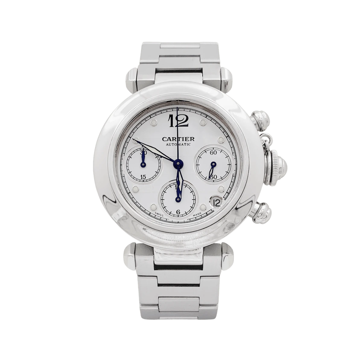 Une montre signée de la Maison Cartier, modèle “Pasha”, en acier sur un bracelet en acier avec double boucle déployante. Cadran blanc, date entre 4 et 5 heures, guichet petite seconde, fonction chronographe.