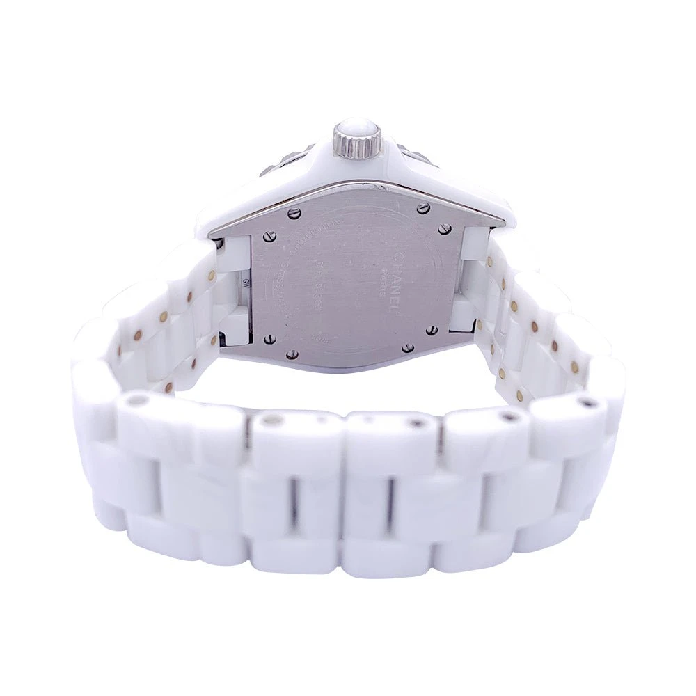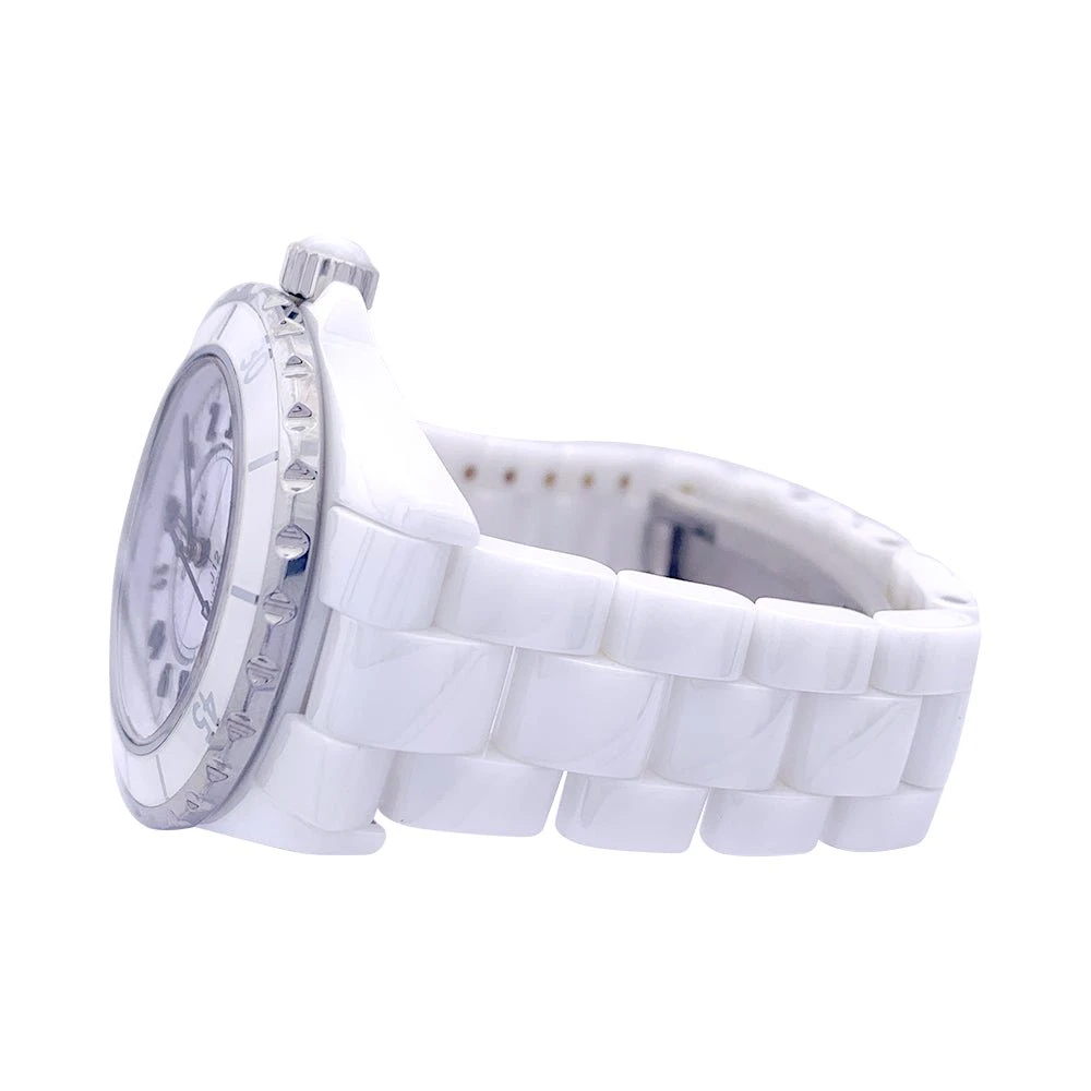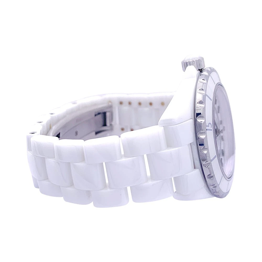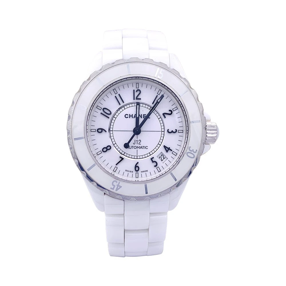 Une montre signée de la Maison Chanel, collection ‘J12’, en céramique blanche sur bracelet en céramique blanche avec double boucle déployante en acier. Cadran blanc, chiffres arabes, date entre 4 et 5h.