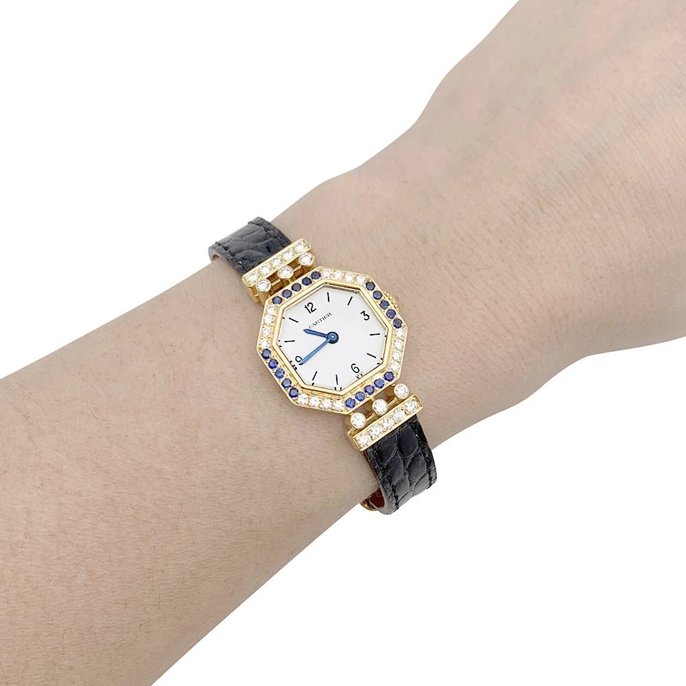 Montre Mécanique CARTIER « Andine » en or jaune 18 carats sur bracelet cuir avec boucle déployante en or rose 18 carats. Cadran octogonal serti de diamants taille brillant et de saphirs ronds, cadran blanc, chiffres arables à 3, 6 et 9 et 12h.