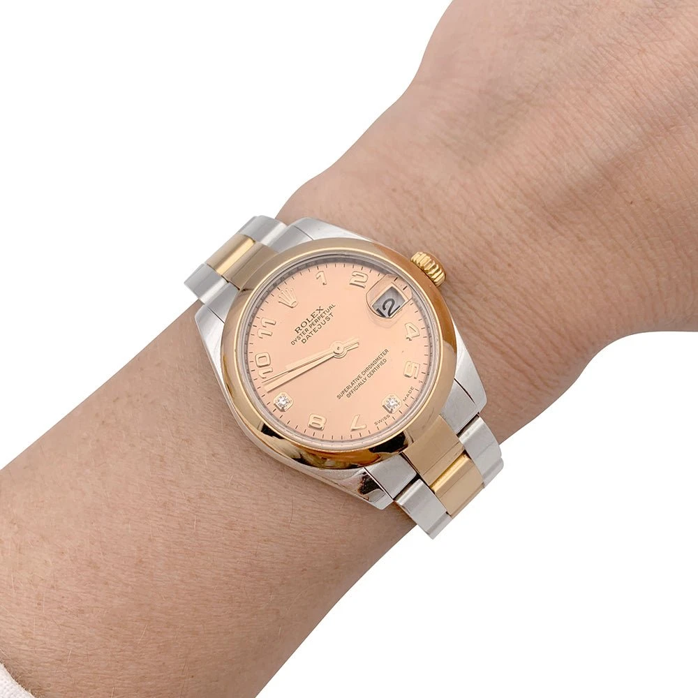 Une montre signée de la Maison Rolex en acier et or rose 750/000, sur bracelet acier et or rose boucle déployante. Cadran en nacre rose, chiffres arabes, deux index diamants, date à 3h.