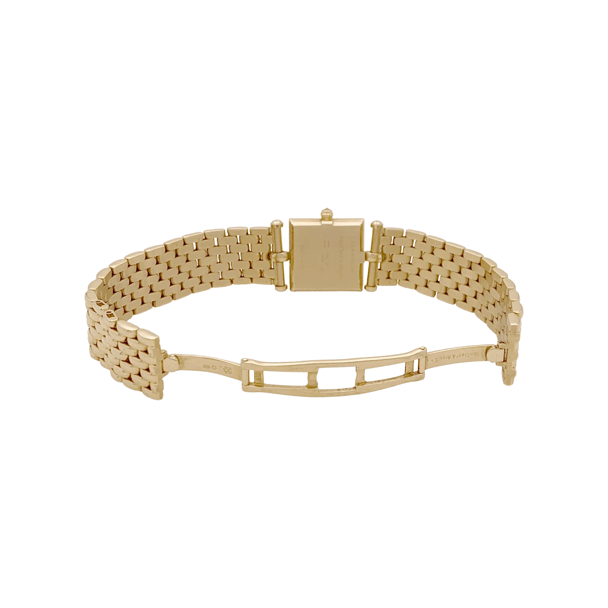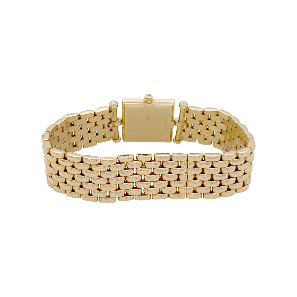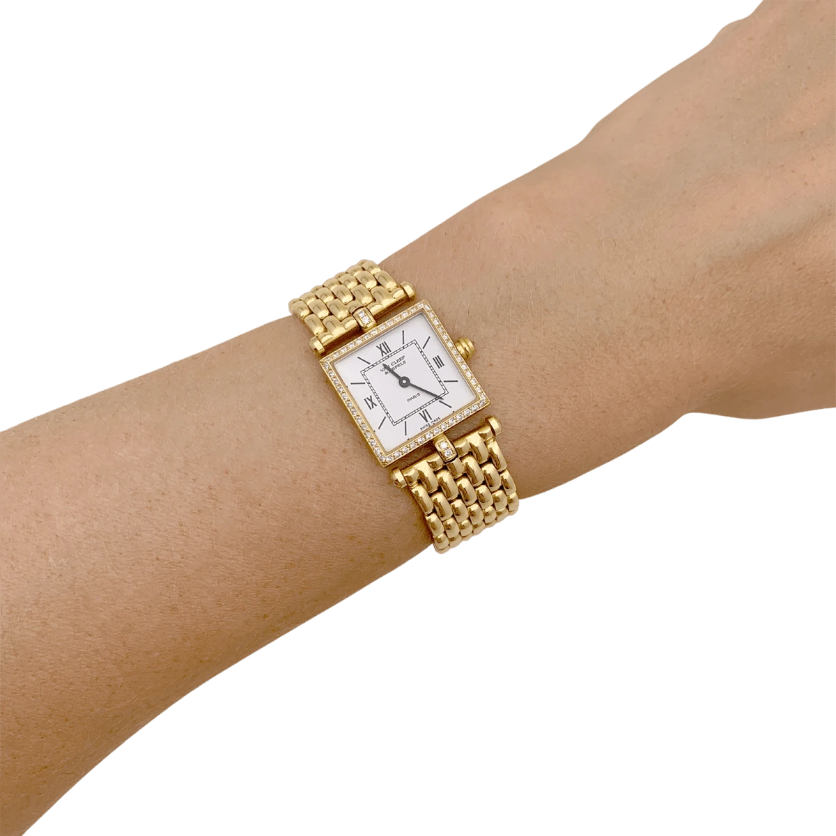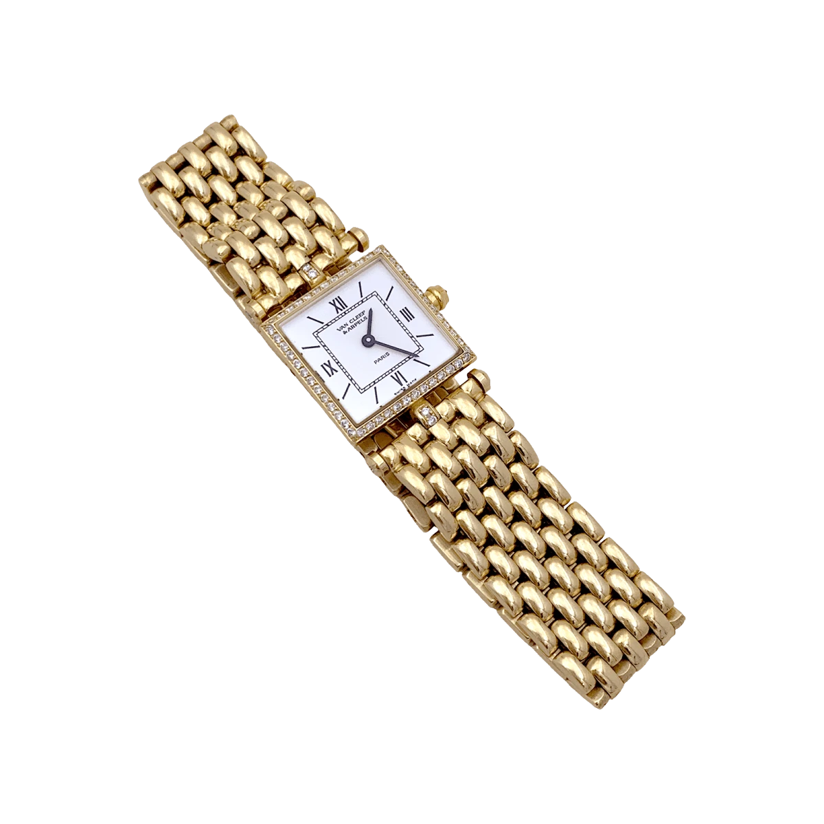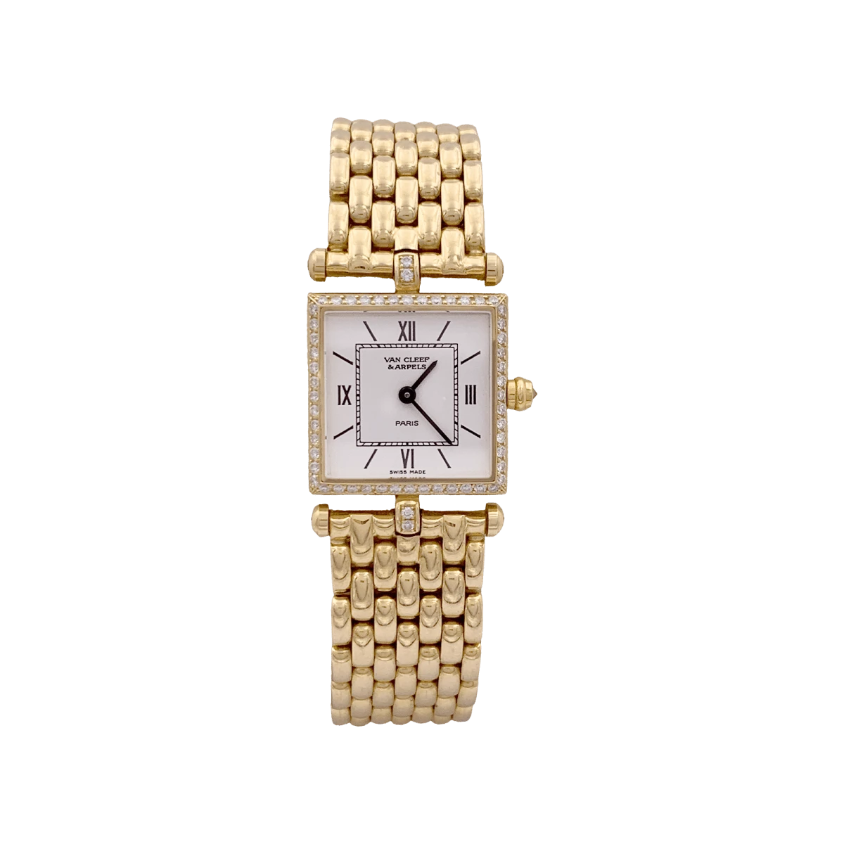 Montre VAN CLEEF & ARPELS « Classique » en or jaune 18 carats cadran carré à fond blanc, lunette sertie de diamants taille brillant, index chiffre romains à 12h, 3h, 6h et 9h