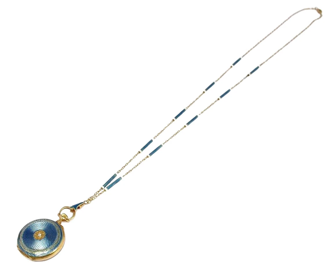 Montre à gousset or jaune 18K émaillée bleu et blanc avec sa chaîne datant de 1900-1910. La montre mouvement mécanique Suisse en état de marche. La chaîne est également alternée de petites barrettes d’émail et d’une chaîne maille ovale. Poinçon: tête de cheval. Poids: 23,8 grs. Longueur chaîne: 64 cm